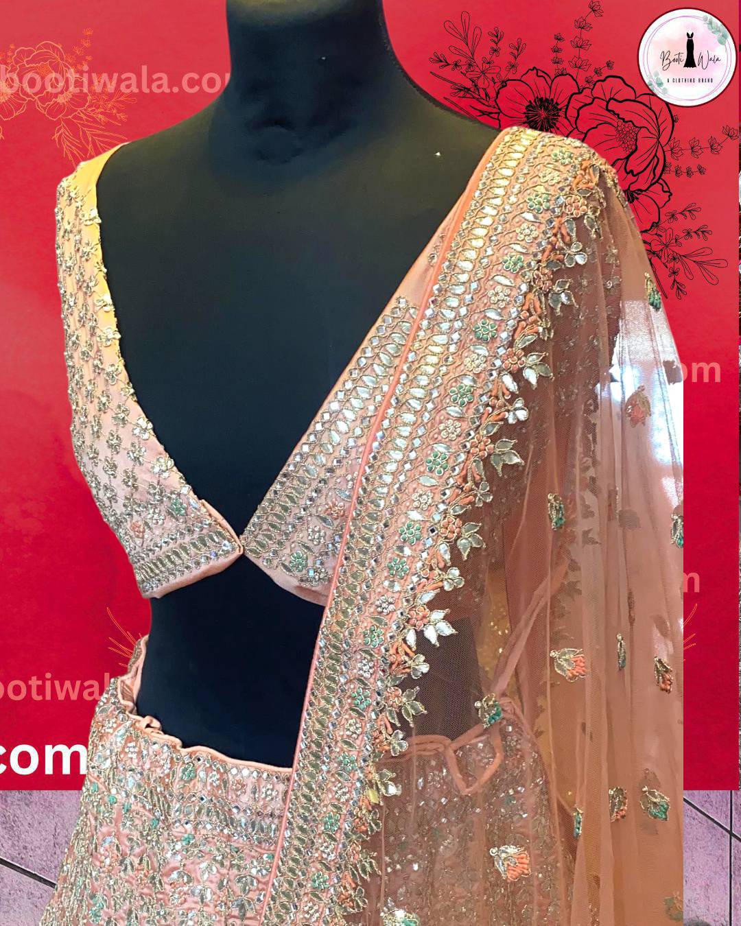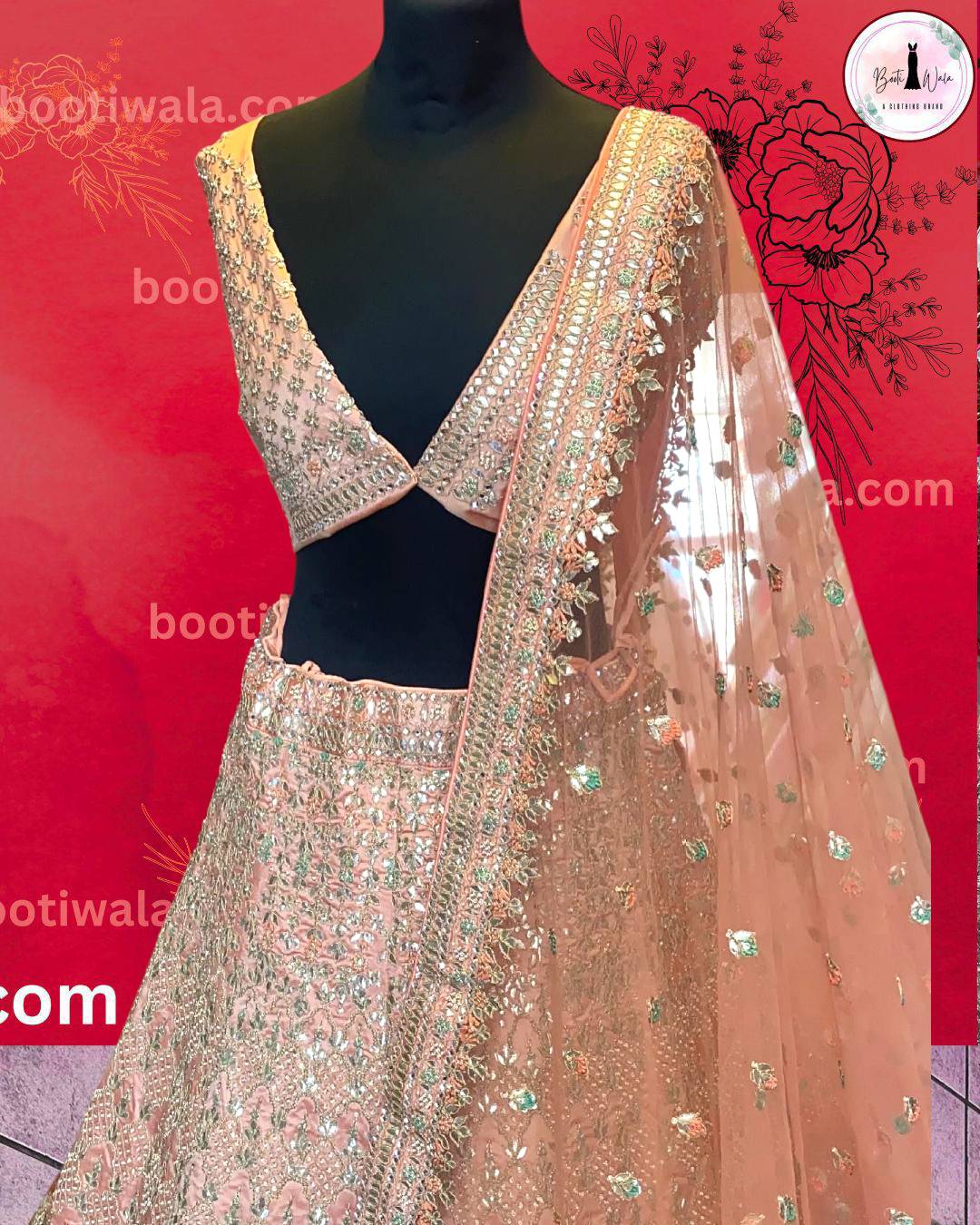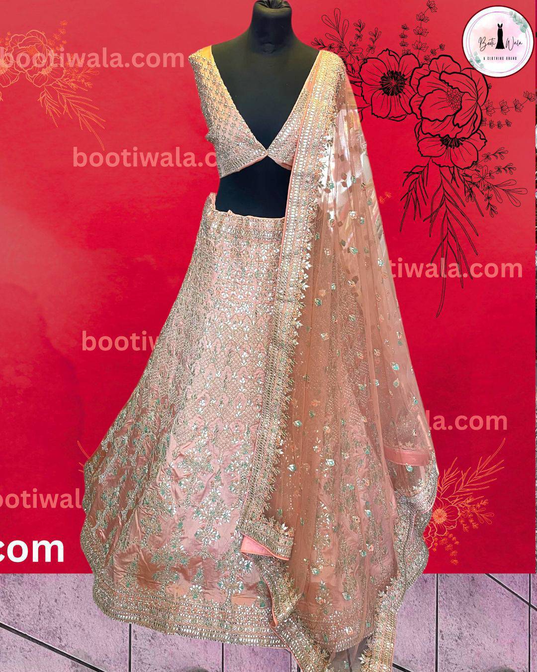 - Product Description – Featuring a magnificent in Raw silk fabric base, an ideal and aesthetically designed for a contemporary Indian bride. This timeless lehenga set has ageless craftsmanship of glass beads and sequins work. It is gracefully accented with kutdana ,Pot, silk thread, and stone detailing, including a georgette handcrafted dupatta to complete the royal bride’s look.