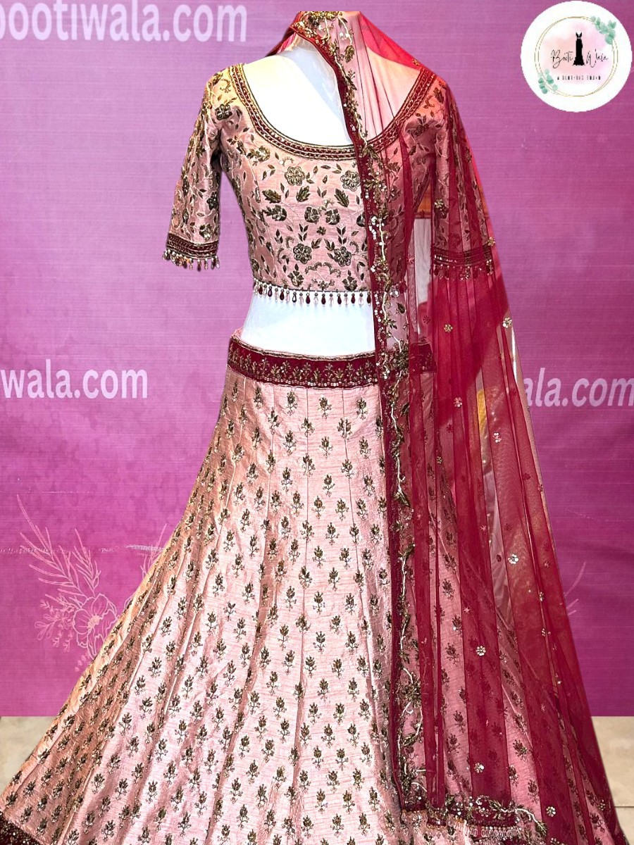 - Product Description – Featuring a magnificent in Raw silk and Net base, an ideal and aesthetically designed for a contemporary Indian bride. This timeless lehenga set has ageless craftsmanship of glass Naqshi, Dabka, Kora, Beads and sequins work. It is gracefully accented with kutdana ,Pot, silk thread, and stone detailing, including a georgette handcrafted dupatta to complete the royal bride’s look.