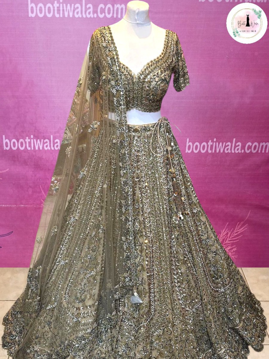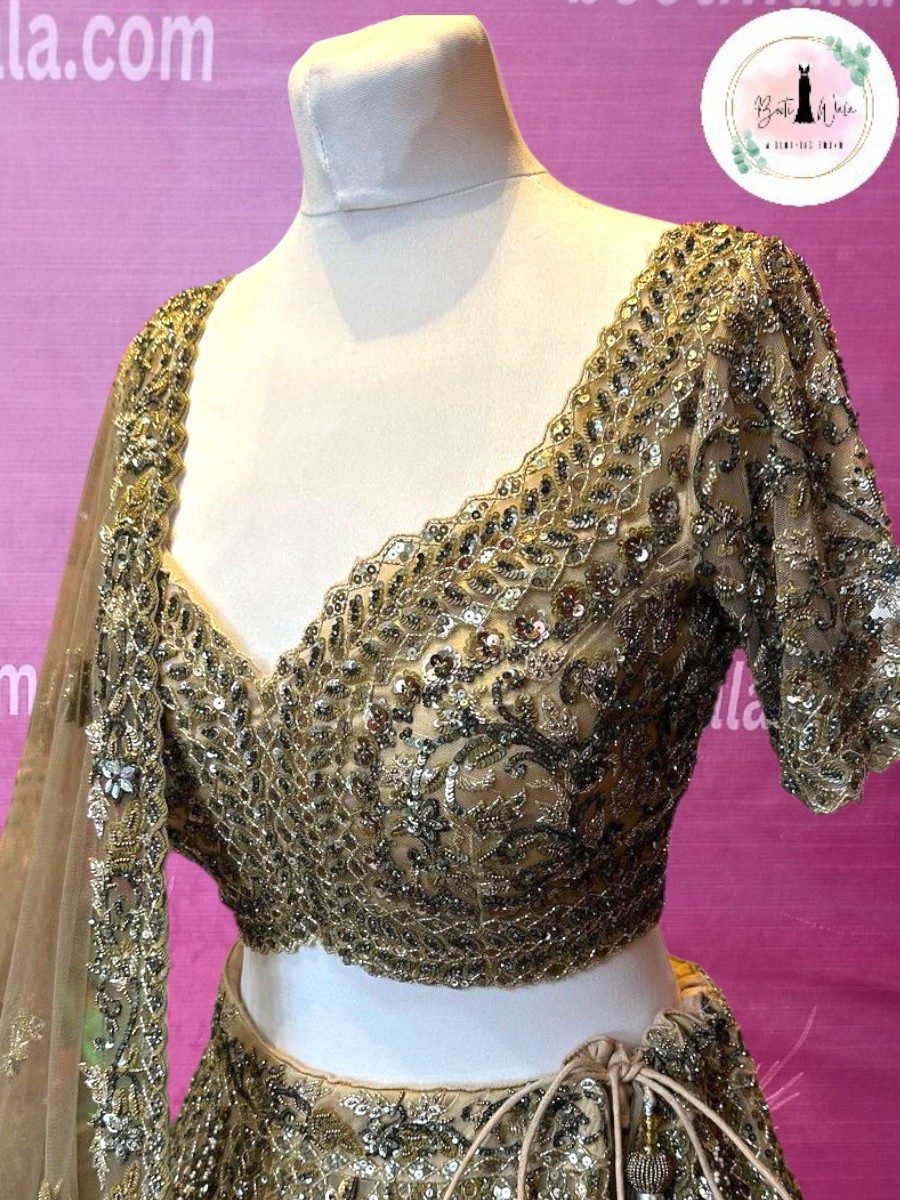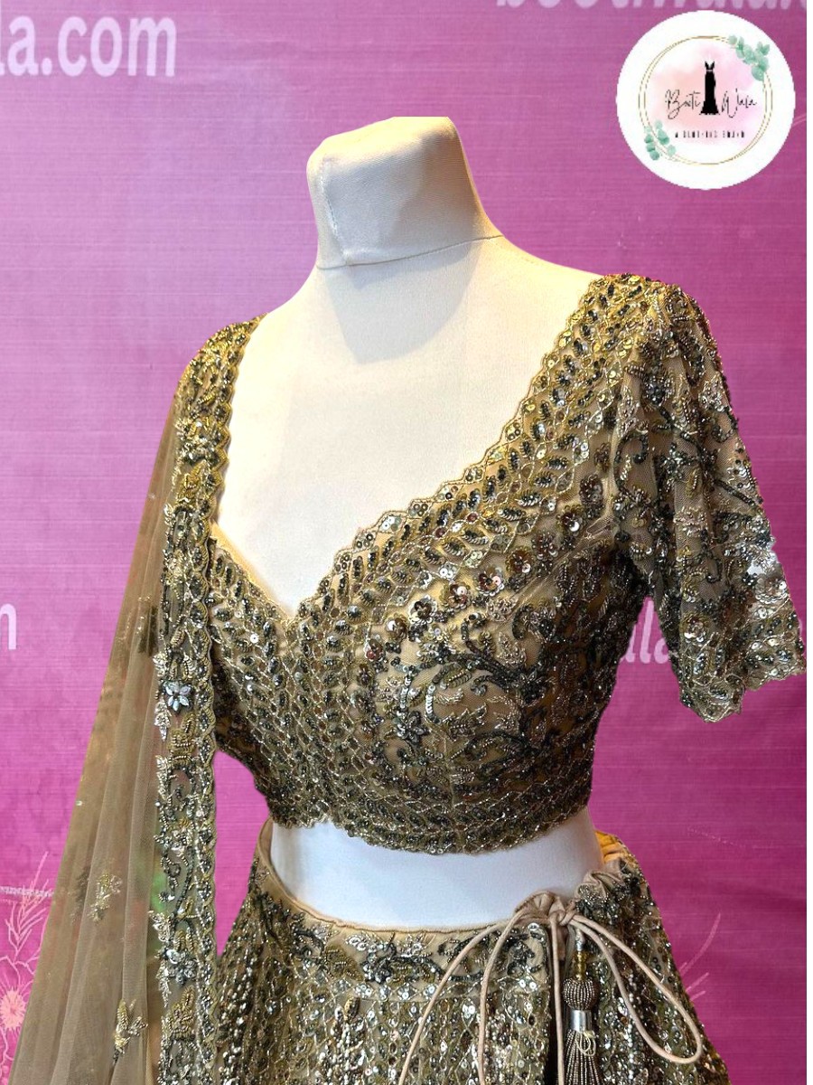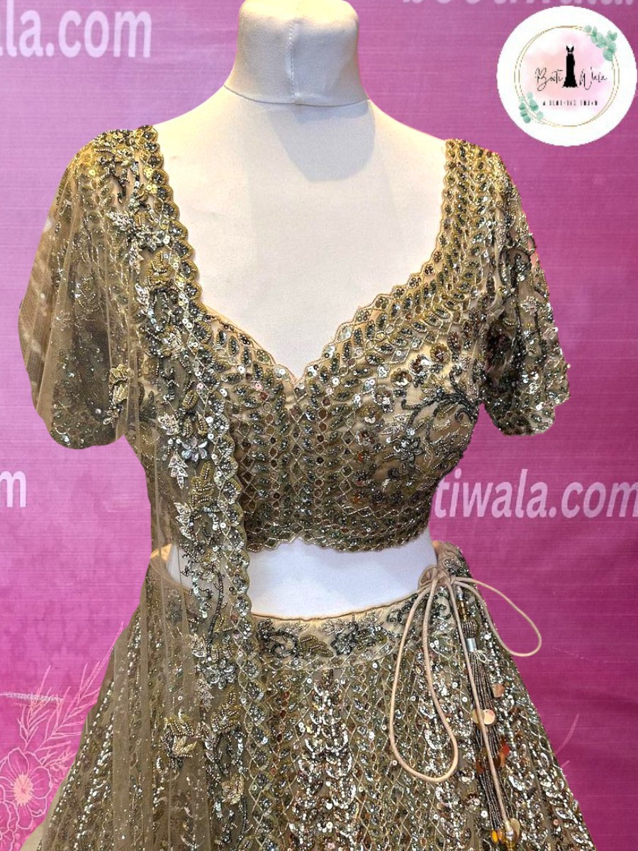 - Product Description – Featuring a magnificent in net fabric base, an ideal and aesthetically designed for a contemporary Indian bride. This timeless lehenga set has ageless craftsmanship of glass beads and sequins work. It is gracefully accented with kutdana ,Pot, silk thread, and stone detailing, including a georgette handcrafted dupatta to complete the royal bride’s look.
