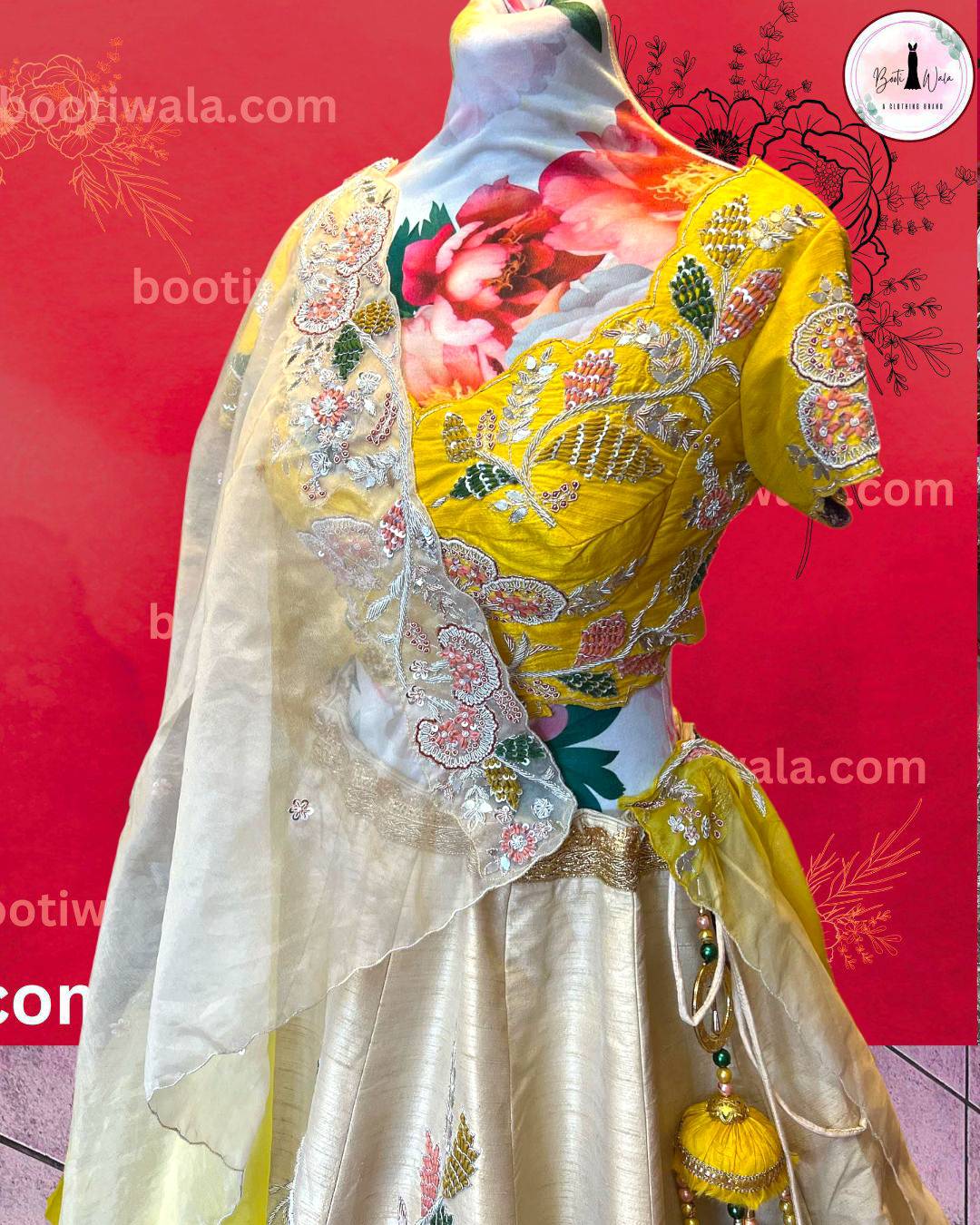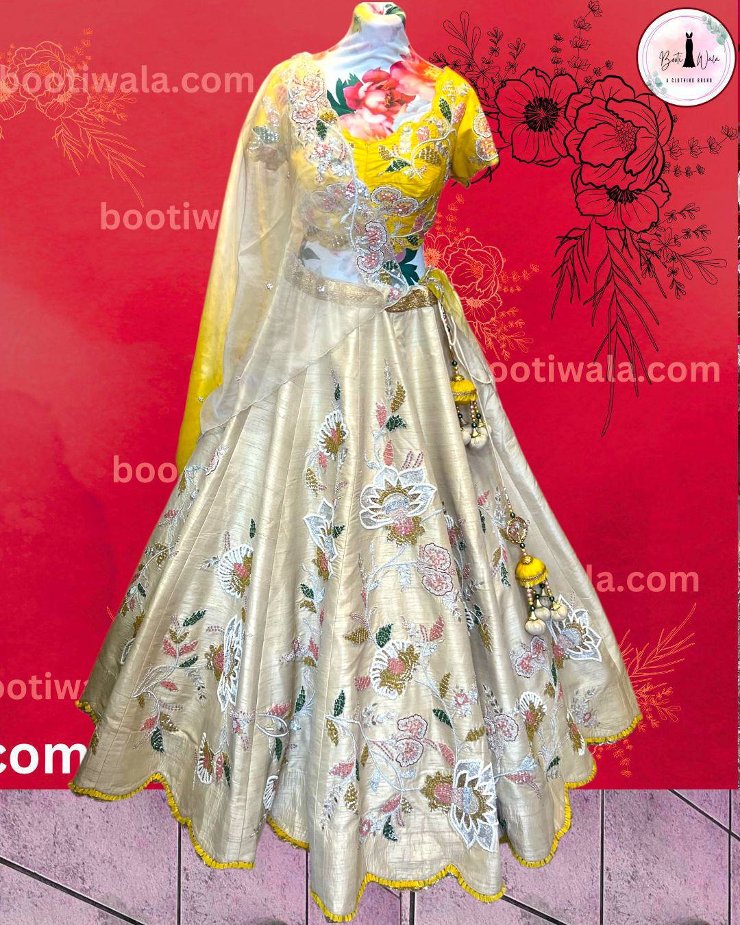 - Product Description – Featuring a magnificent in Raw silk fabric base, an ideal and aesthetically designed for a contemporary Indian bride. This timeless lehenga set has ageless craftsmanship of glass beads and sequins work. It is gracefully accented with kutdana ,Pot, silk thread, and stone detailing, including a georgette handcrafted dupatta to complete the royal bride’s look.