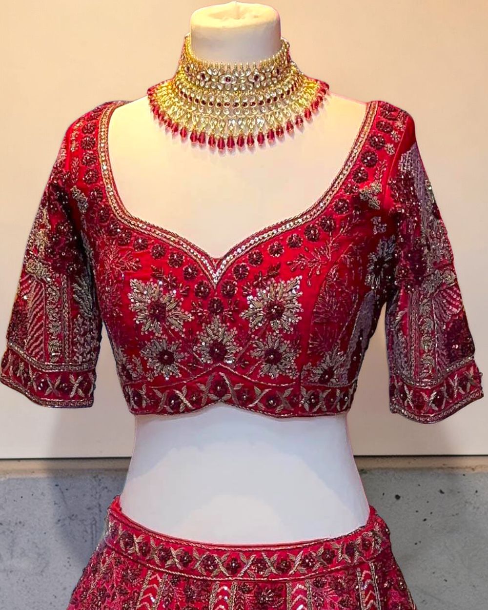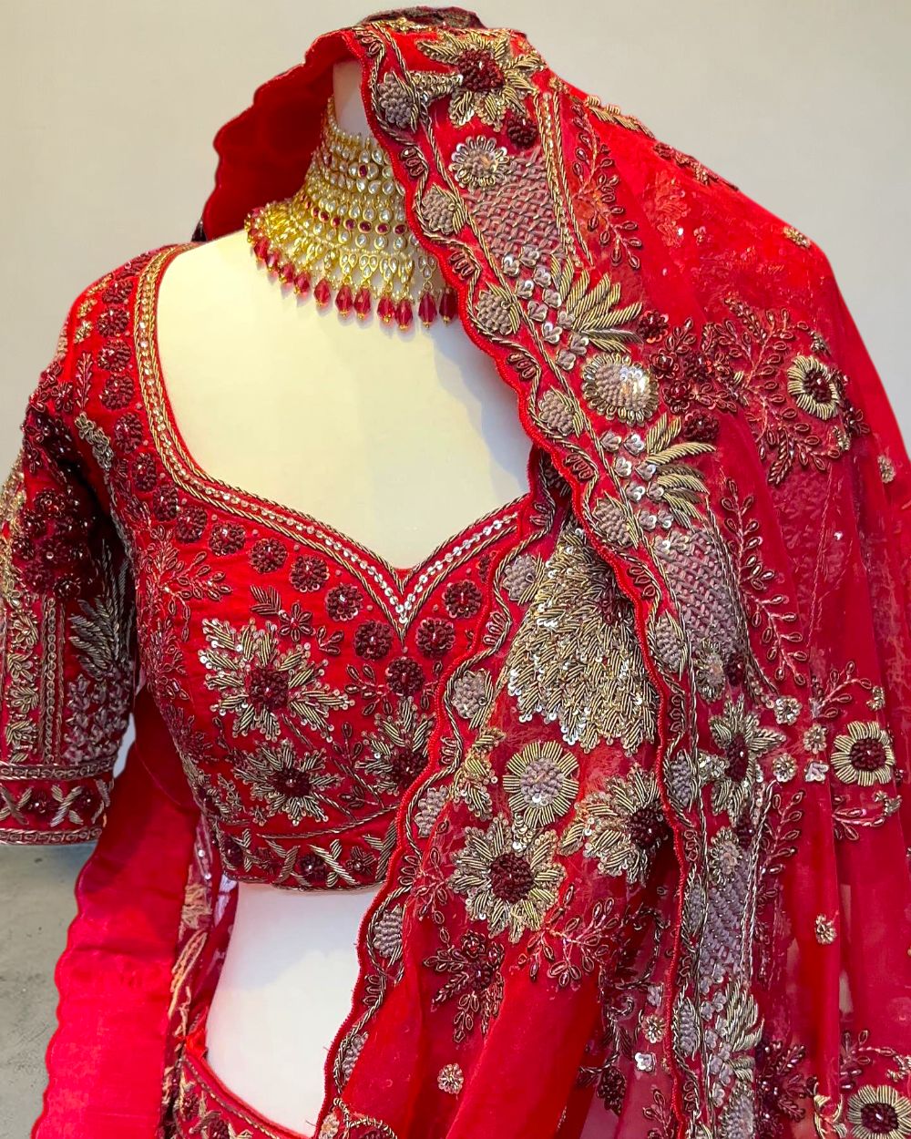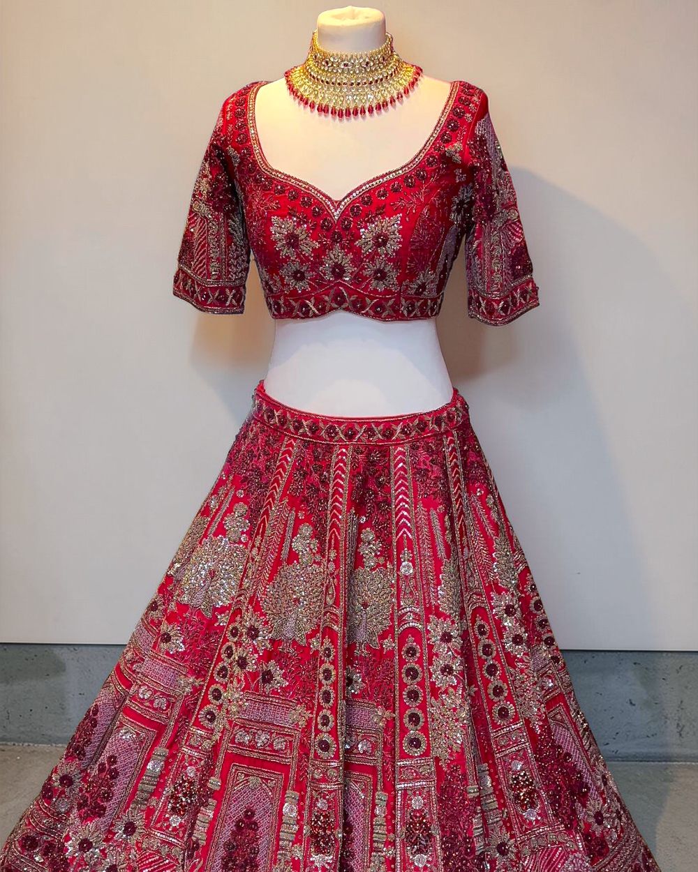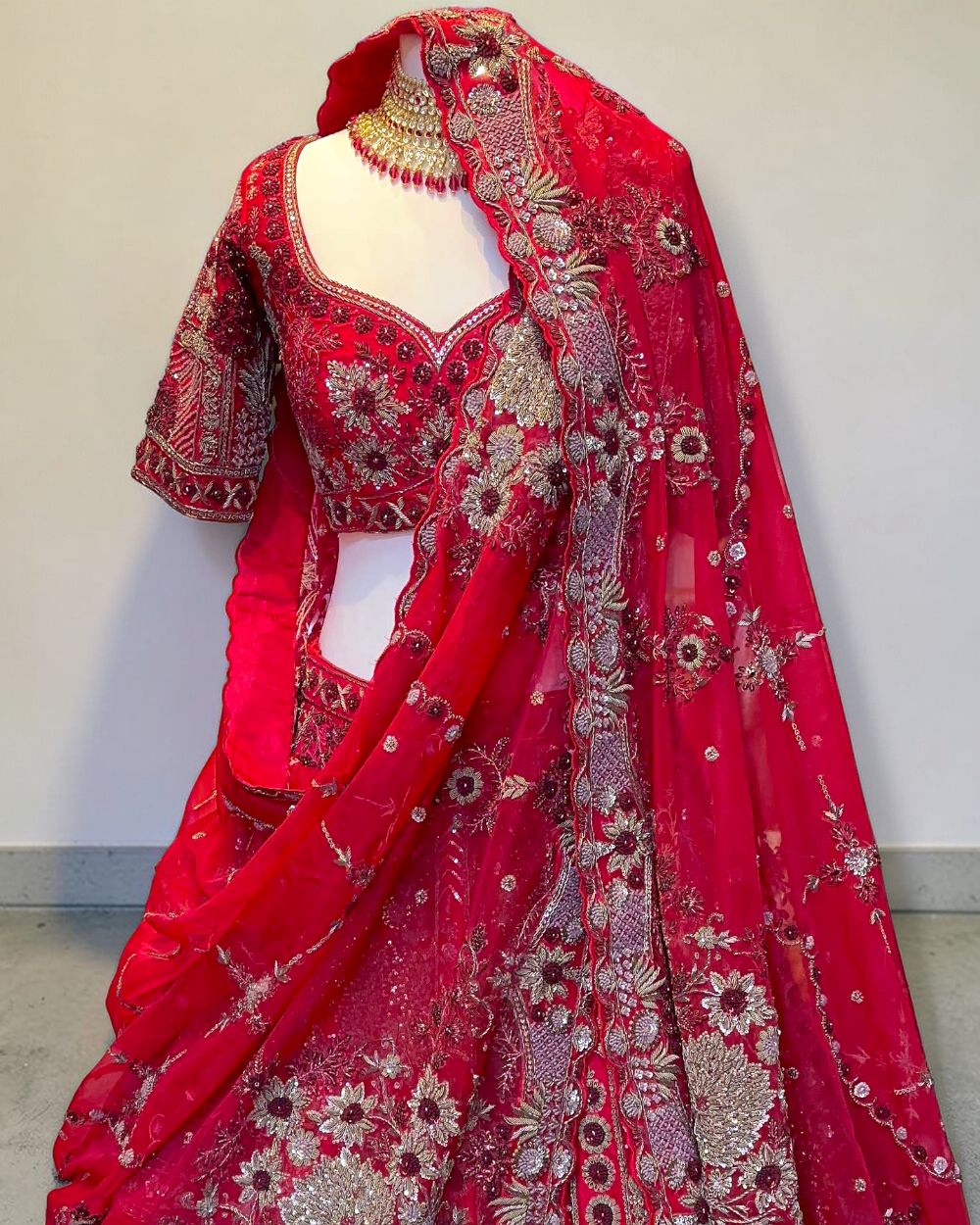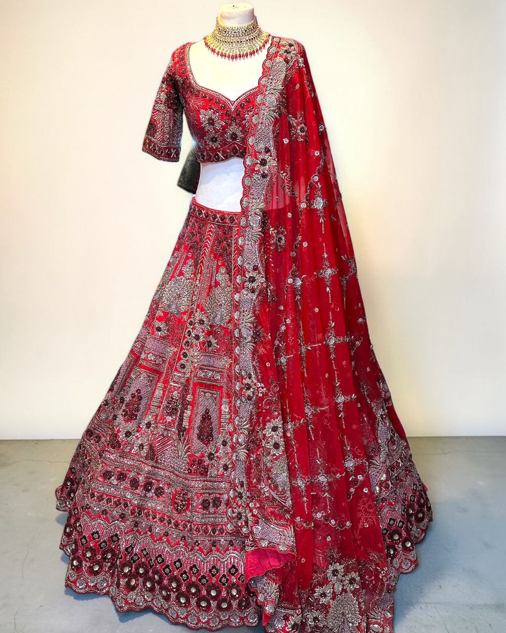 - Product Description – Featuring a magnificent in Velvet and net base, an ideal and aesthetically designed for a contemporary Indian bride. This timeless lehenga set has ageless craftsmanship of glass Naqshi, Dabka, Kora, Beads and sequins work. It is gracefully accented with kutdana ,Pot, silk thread, and stone detailing, including a georgette handcrafted dupatta to complete the royal bride’s look.
