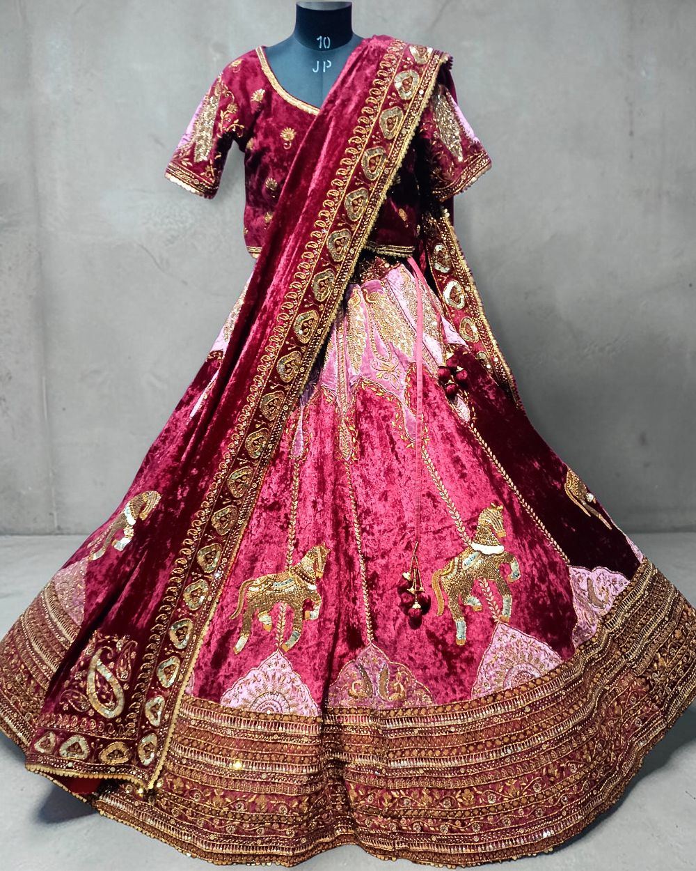 - Product Description – Featuring a magnificent in Velvet fabric base, an ideal and aesthetically designed for a contemporary Indian bride. This timeless lehenga set has ageless craftsmanship of glass beads and sequins work. It is gracefully accented with kutdana ,Pot, silk thread, and stone detailing, including a georgette handcrafted dupatta to complete the royal bride’s look.