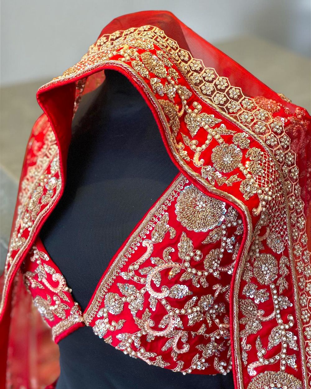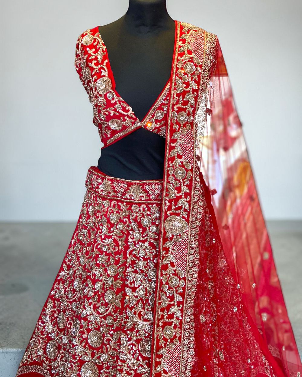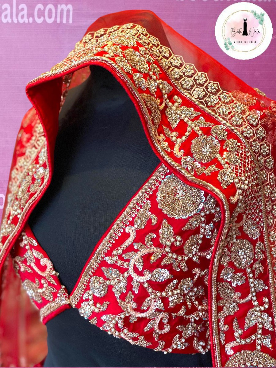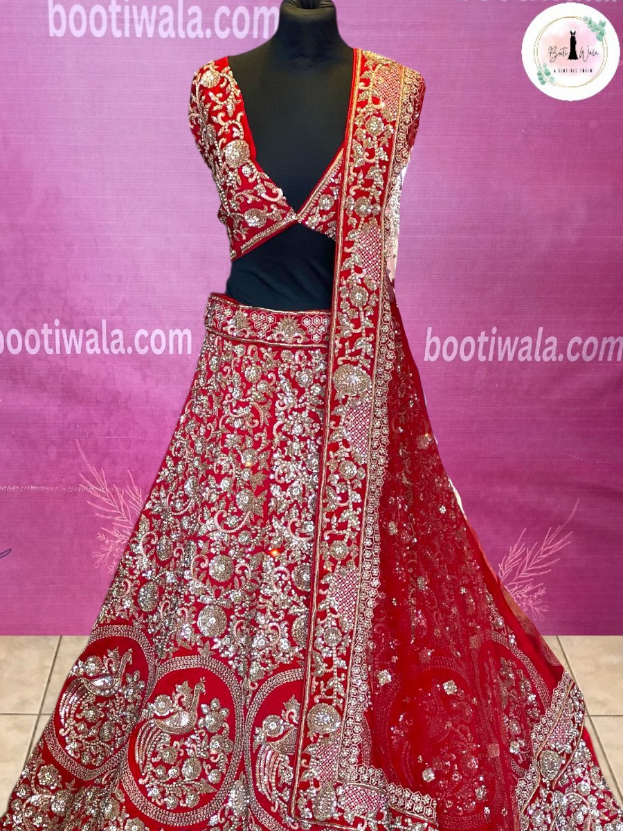 - Product Description – Featuring a magnificent in Velvet and net base, an ideal and aesthetically designed for a contemporary Indian bride. This timeless lehenga set has ageless craftsmanship of glass Naqshi, Dabka, Kora, Beads and sequins work. It is gracefully accented with kutdana ,Pot, silk thread, and stone detailing, including a georgette handcrafted dupatta to complete the royal bride’s look.