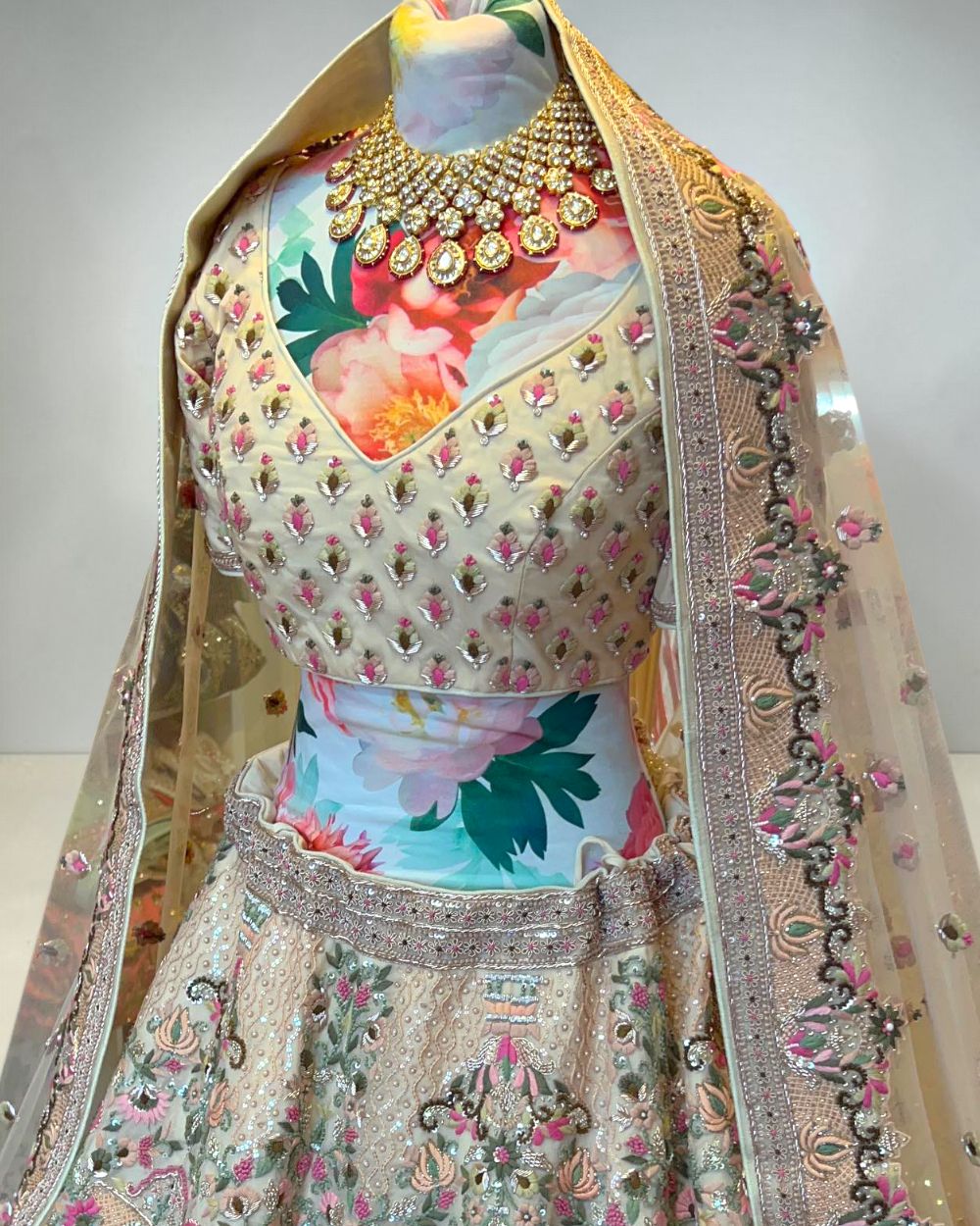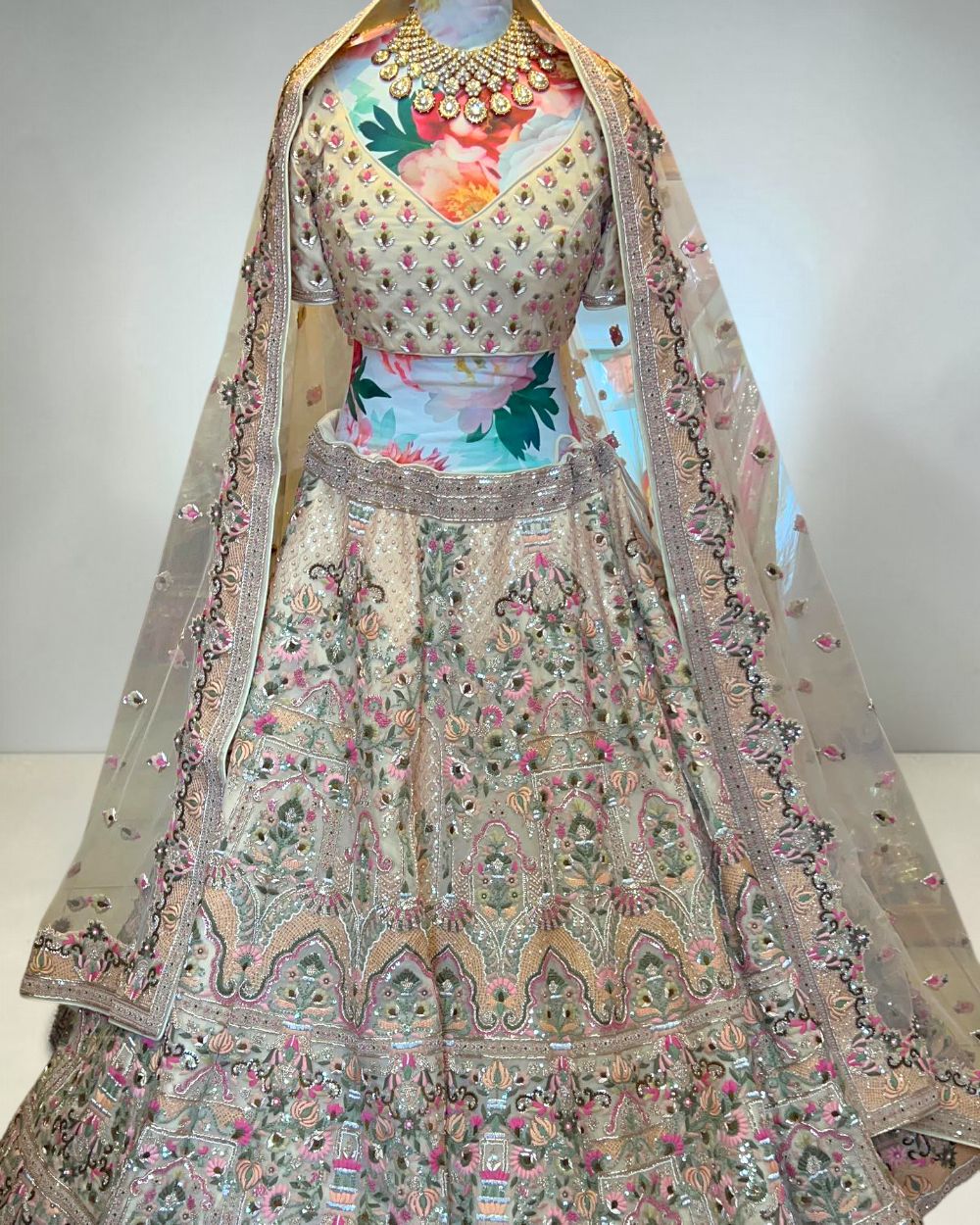 - Product Description – Featuring a magnificent in Raw Silk and net base, an ideal and aesthetically designed for a contemporary Indian bride. This timeless lehenga set has ageless craftsmanship of glass Naqshi, Dabka, Kora, Beads and sequins work. It is gracefully accented with kutdana ,Pot, silk thread, and stone detailing, including a georgette handcrafted dupatta to complete the royal bride’s look.
