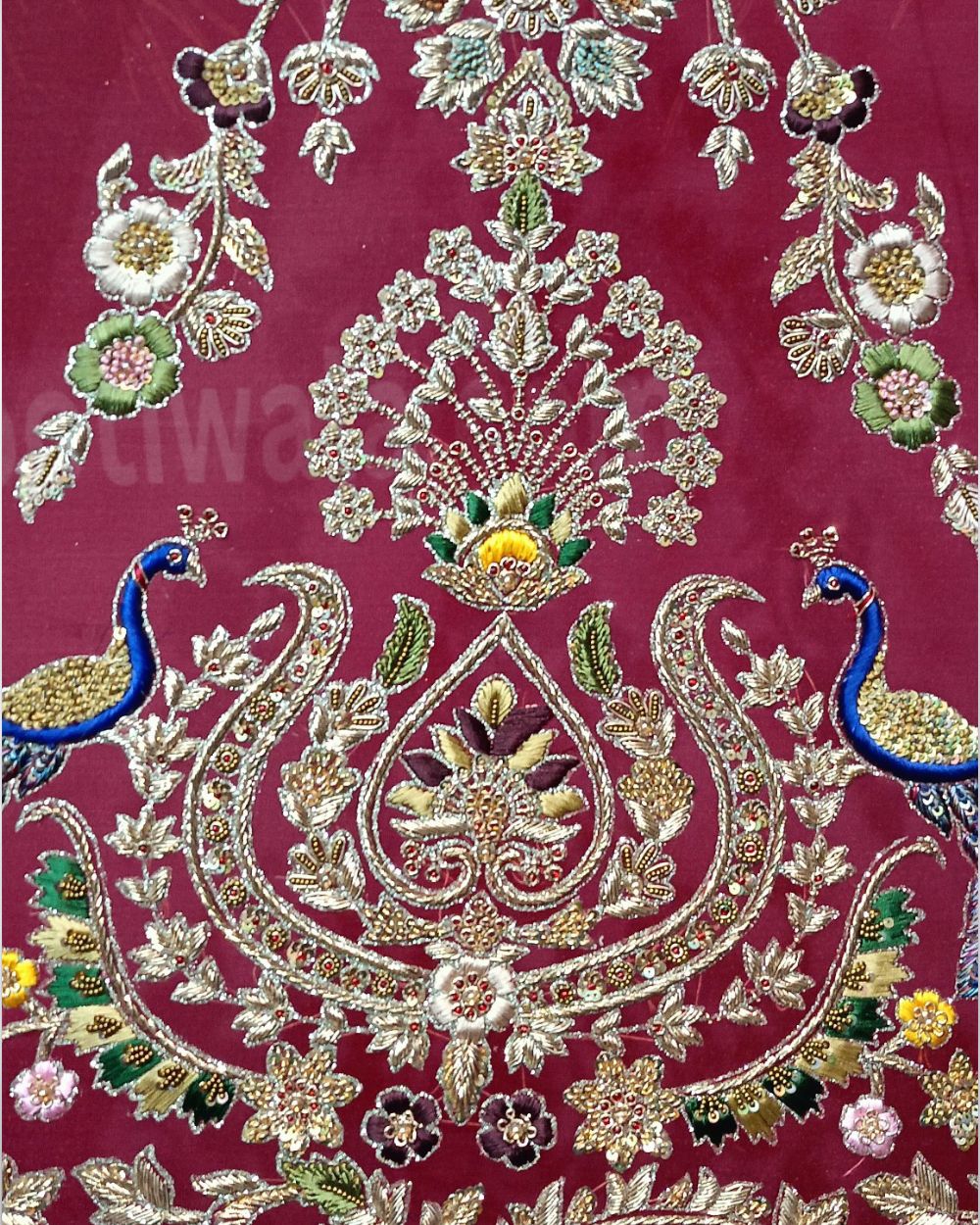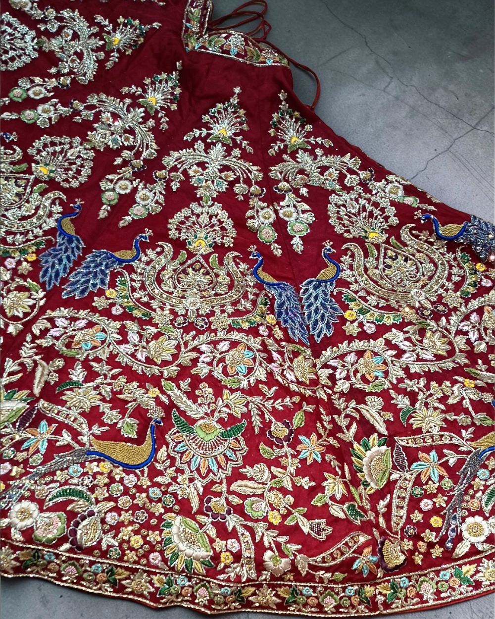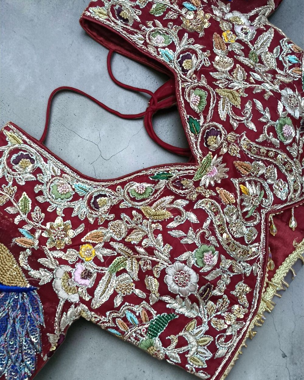 Featuring a magnificent in Velvet and Raw Silk base, an ideal and aesthetically designed for a contemporary Indian bride. This timeless Lehenga set has ageless craftsmanship of glass beads and sequins work. It is gracefully accented with Kutdana ,Pot, silk thread, and stone detailing, including Net with Velvet around border handcrafted dupatta to complete the royal bride's look.​