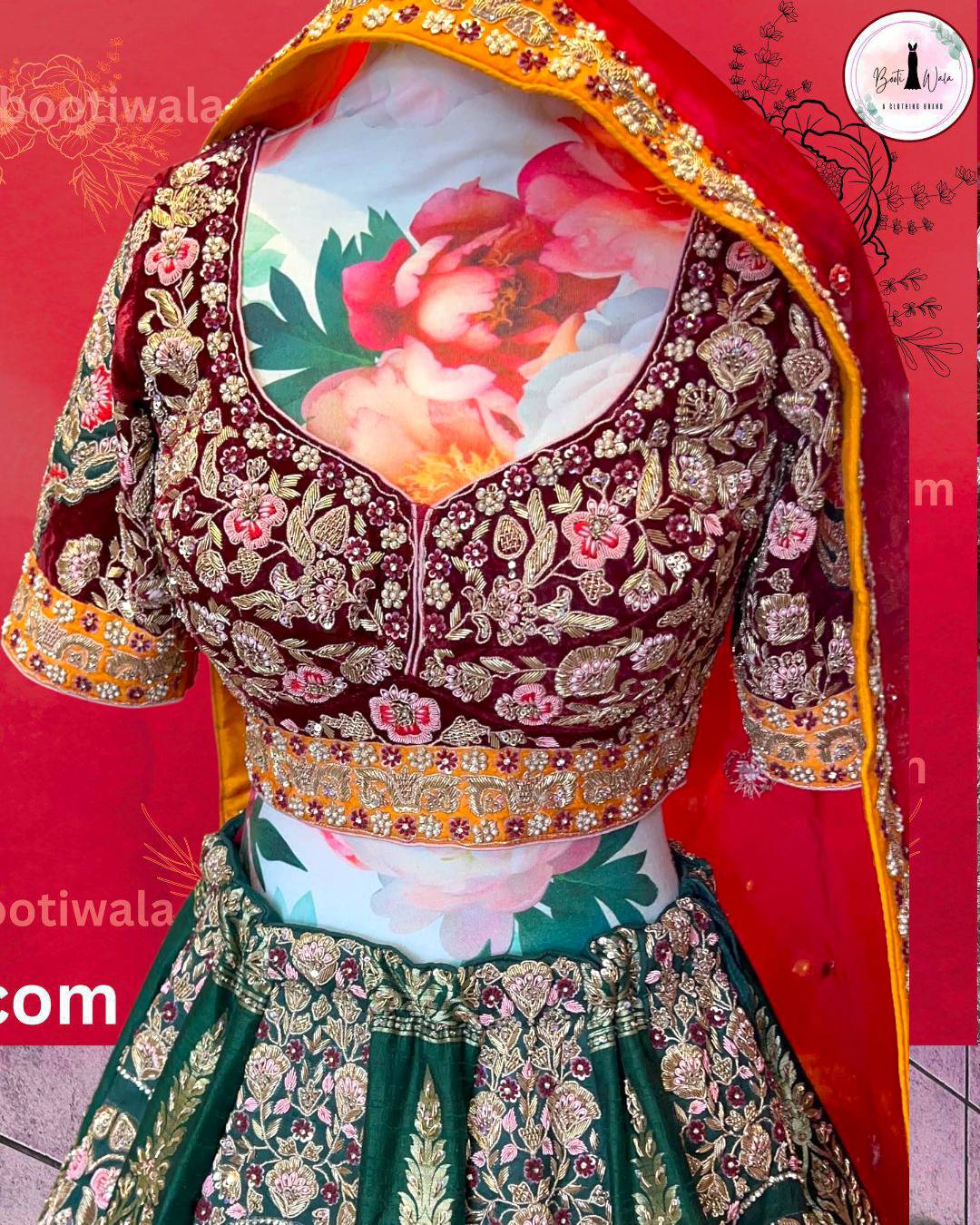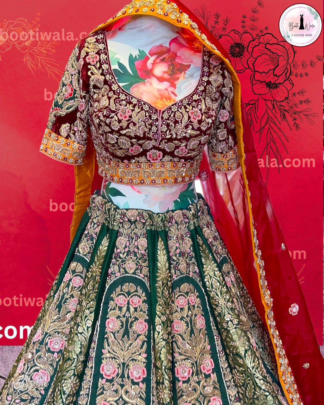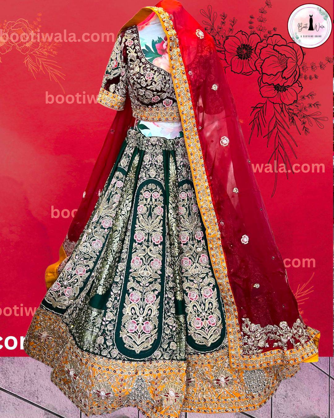 - Product Description – Featuring a magnificent in Velvet and net base, an ideal and aesthetically designed for a contemporary Indian bride. This timeless lehenga set has ageless craftsmanship of glass Naqshi, Dabka, Kora, Beads and sequins work. It is gracefully accented with kutdana ,Pot, silk thread, and stone detailing, including a georgette handcrafted dupatta to complete the royal bride’s look.