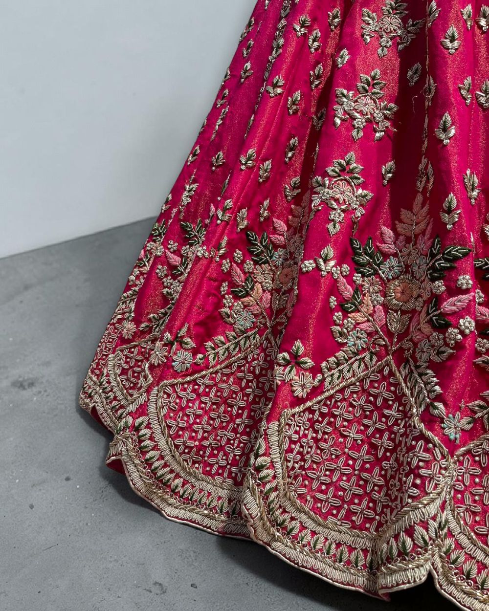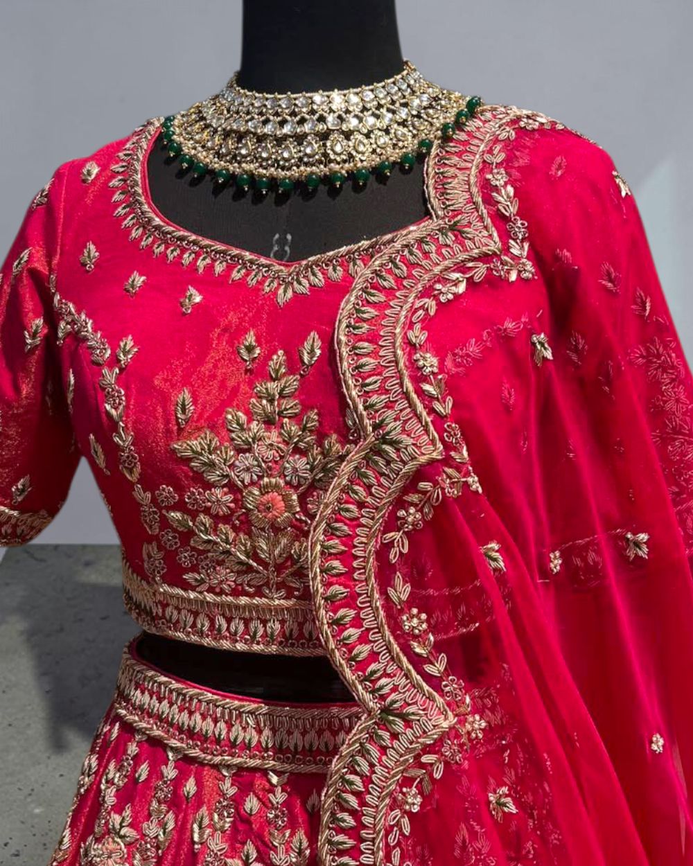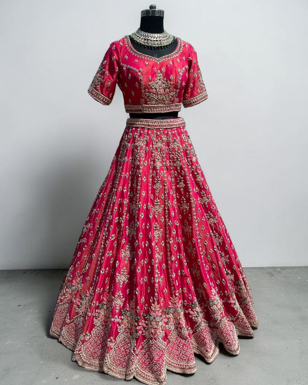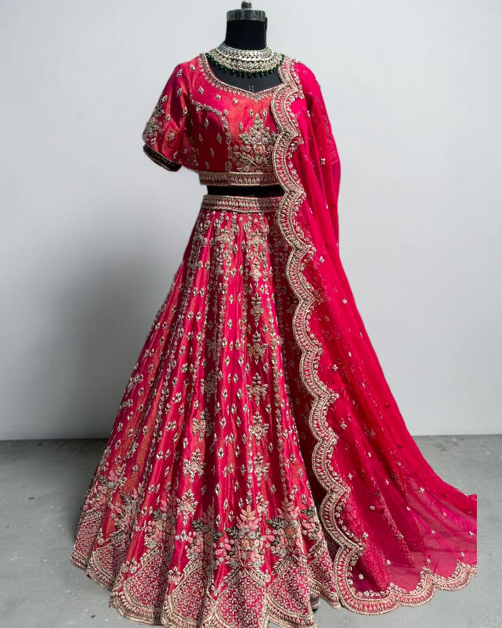 - Product Description – Featuring a magnificent in Velvet and net base, an ideal and aesthetically designed for a contemporary Indian bride. This timeless lehenga set has ageless craftsmanship of glass Naqshi, Dabka, Kora, Beads and sequins work. It is gracefully accented with kutdana ,Pot, silk thread, and stone detailing, including a georgette handcrafted dupatta to complete the royal bride’s look.