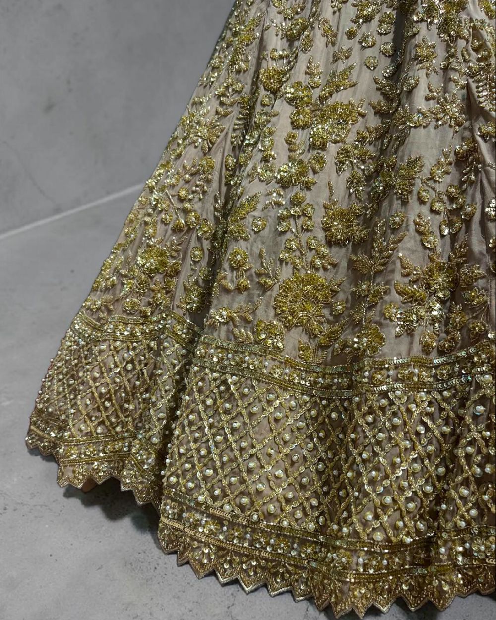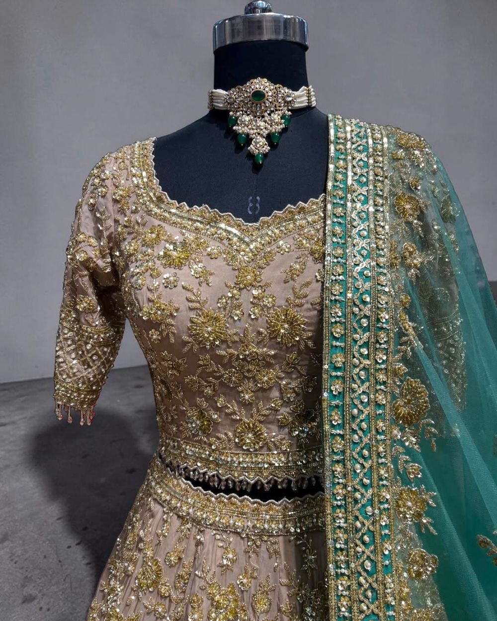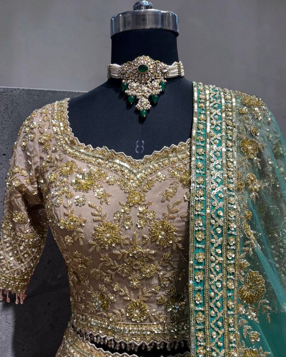 - Product Description – Featuring a magnificent in Velvet and Net base, an ideal and aesthetically designed for a contemporary Indian bride. This timeless lehenga set has ageless craftsmanship of glass Naqshi, Dabka, Kora, Beads and sequins work. It is gracefully accented with kutdana ,Pot, silk thread, and stone detailing, including a georgette handcrafted dupatta to complete the royal bride’s look.