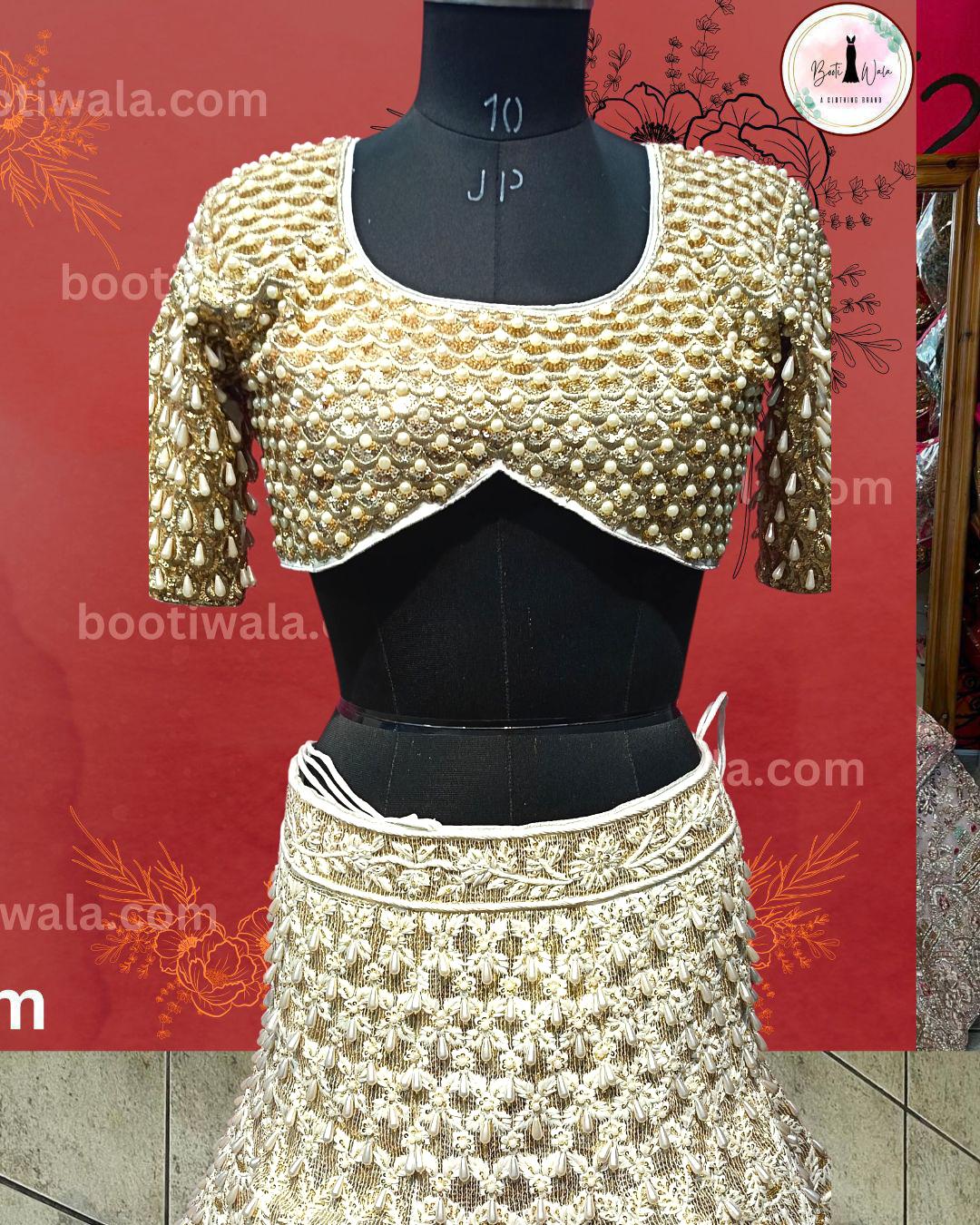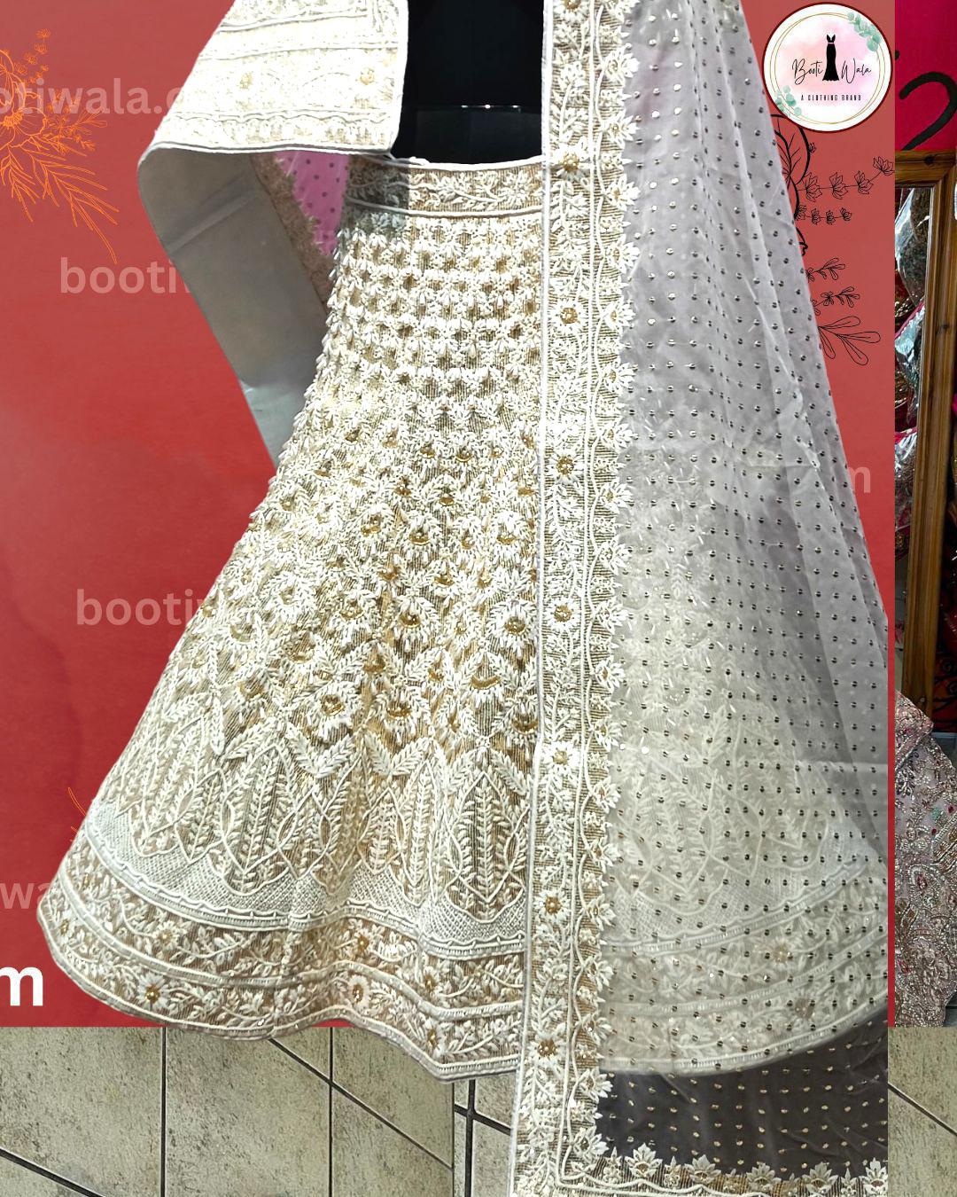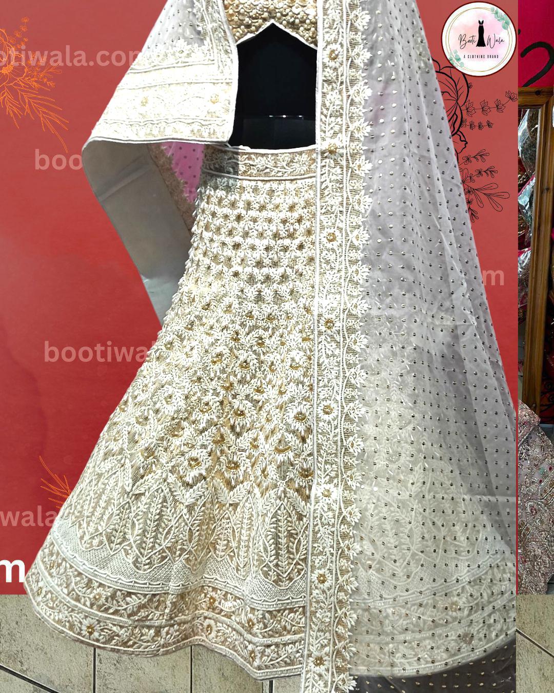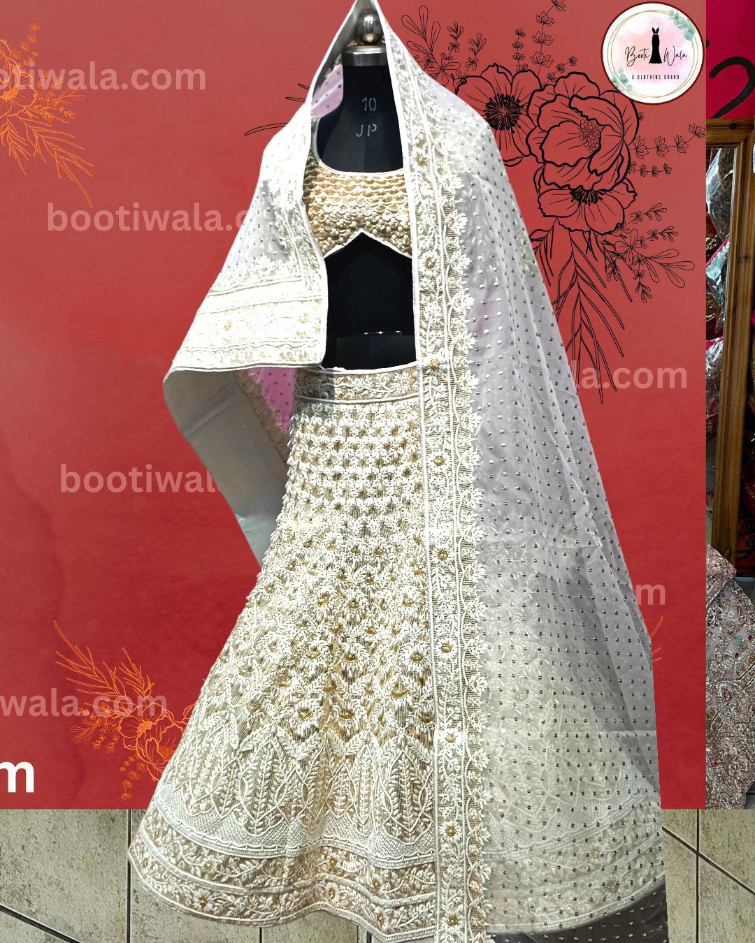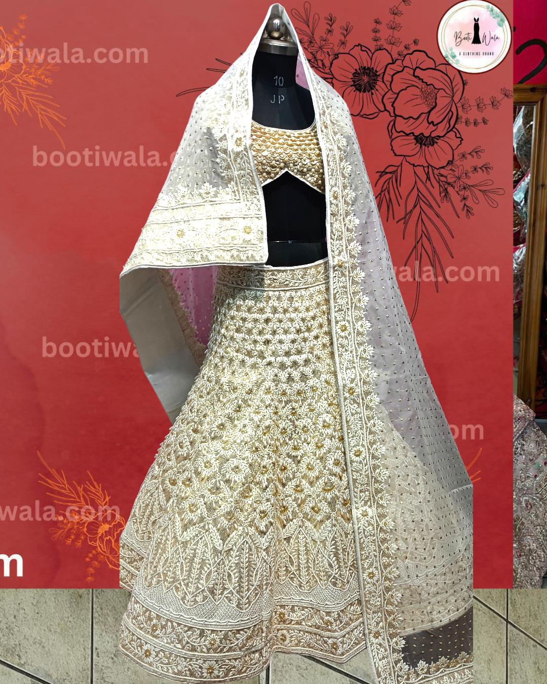 - Product Description – Featuring a magnificent in Raw silk and Net base, an ideal and aesthetically designed for a contemporary Indian bride. This timeless lehenga set has ageless craftsmanship of glass Naqshi, Dabka, Kora, Beads and sequins work. It is gracefully accented with kutdana ,Pot, silk thread, and stone detailing, including a georgette handcrafted dupatta to complete the royal bride’s look.