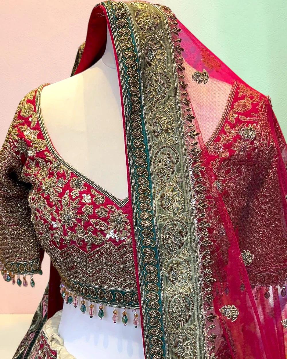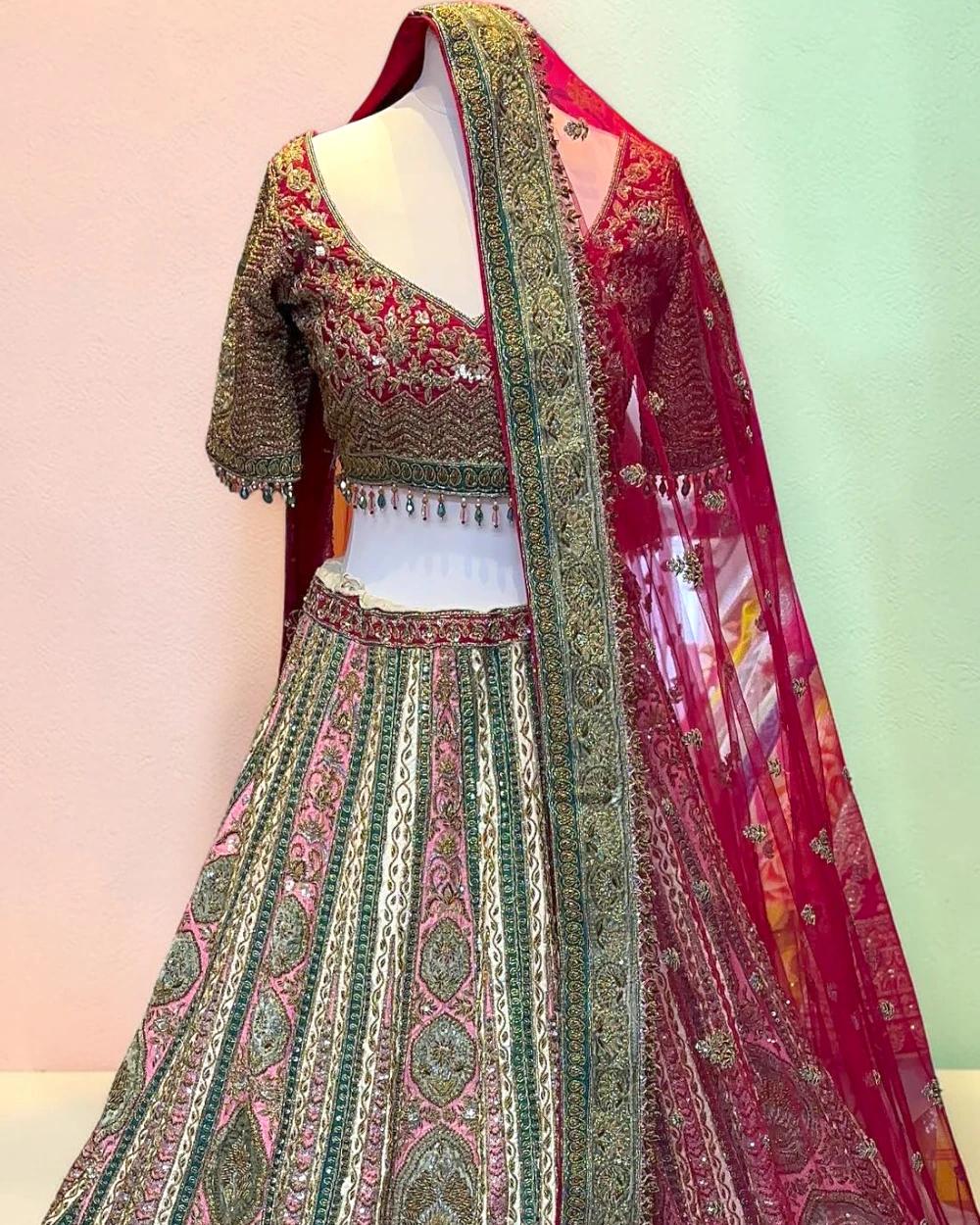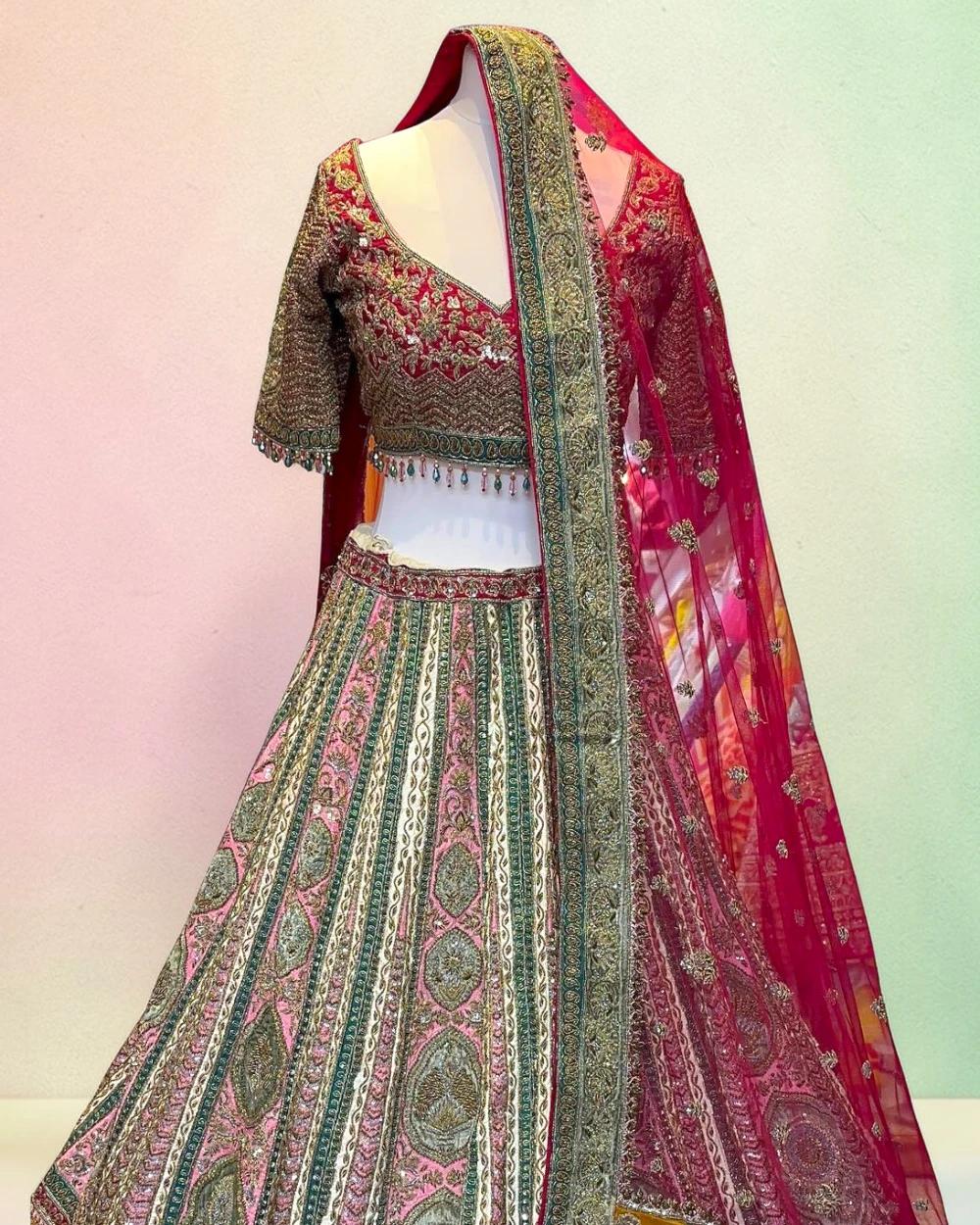 - Product Description – Featuring a magnificent in Raw silk and Net base, an ideal and aesthetically designed for a contemporary Indian bride. This timeless lehenga set has ageless craftsmanship of glass Naqshi, Dabka, Kora, Beads and sequins work. It is gracefully accented with kutdana ,Pot, silk thread, and stone detailing, including a georgette handcrafted dupatta to complete the royal bride’s look.