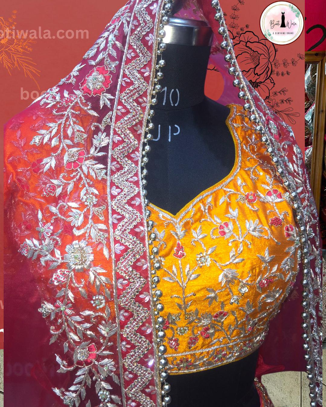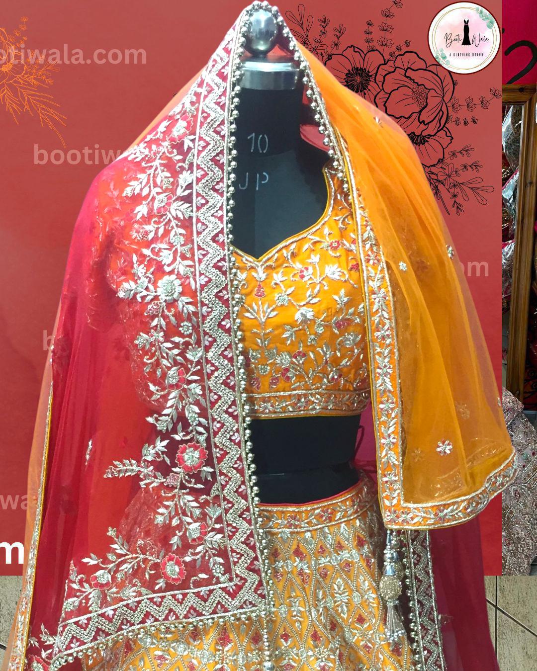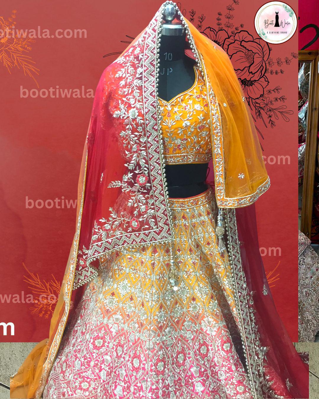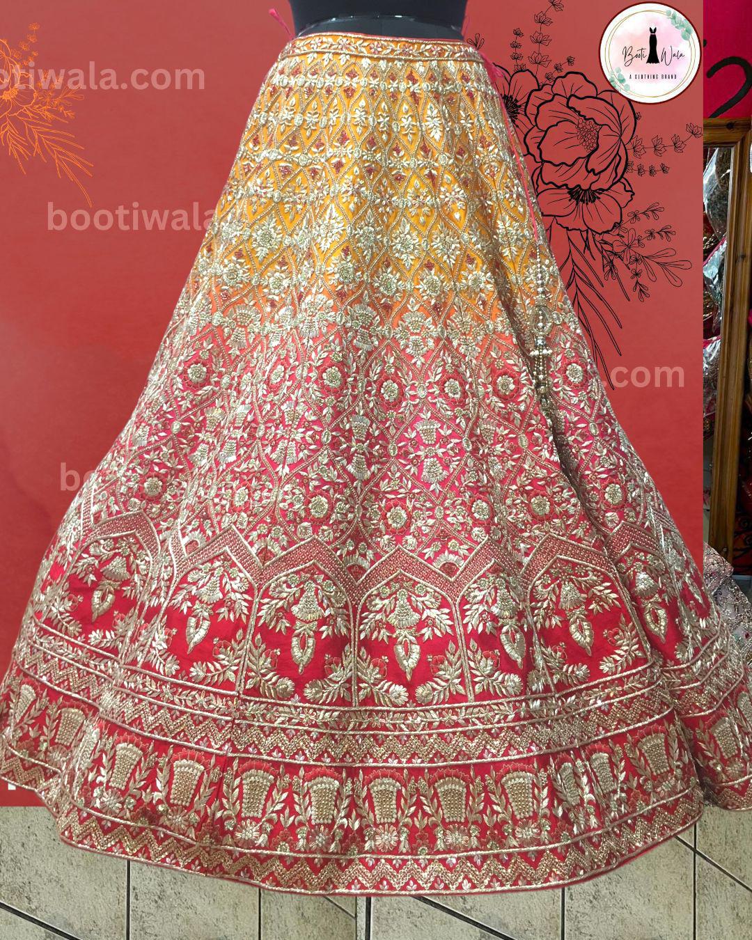 - Product Description – Featuring a magnificent in Raw silk and Net base, an ideal and aesthetically designed for a contemporary Indian bride. This timeless lehenga set has ageless craftsmanship of glass Naqshi, Dabka, Kora, Beads and sequins work. It is gracefully accented with kutdana ,Pot, silk thread, and stone detailing, including a georgette handcrafted dupatta to complete the royal bride’s look.