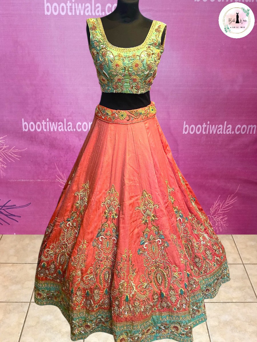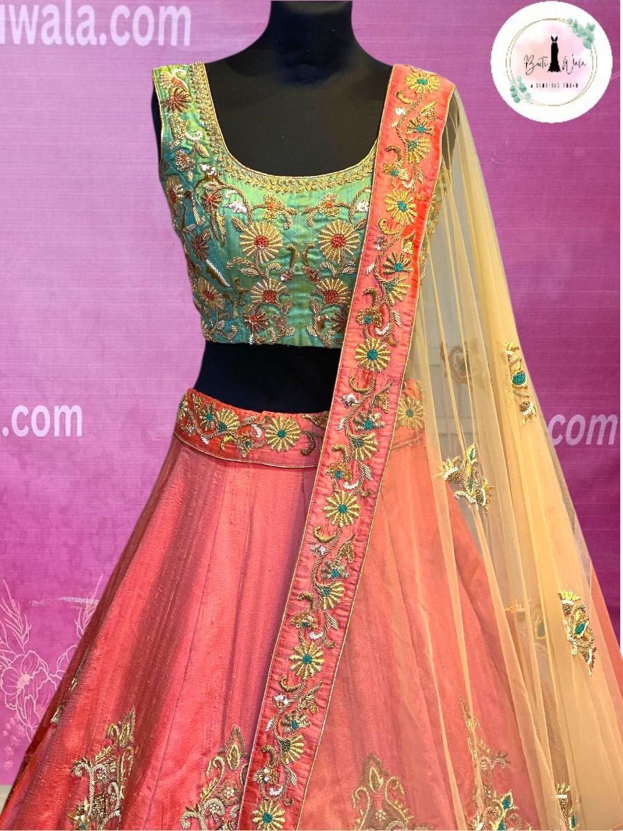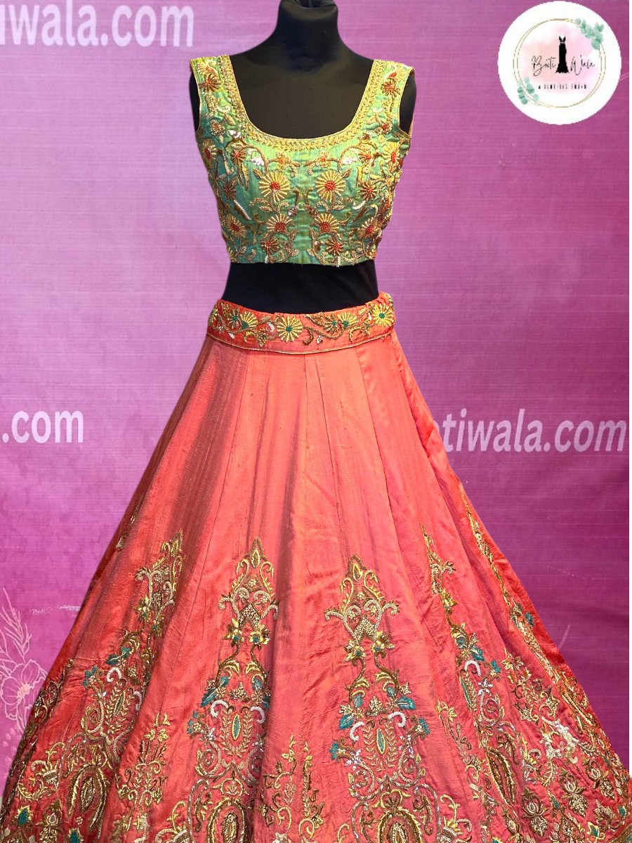 - Product Description – Featuring a magnificent in Raw silk and Organza silk base, an ideal and aesthetically designed for a contemporary Indian bride. This timeless lehenga set has ageless craftsmanship of glass beads and sequins work. It is gracefully accented with kutdana ,Pot, silk thread, and stone detailing, including a georgette handcrafted dupatta to complete the royal bride’s look.