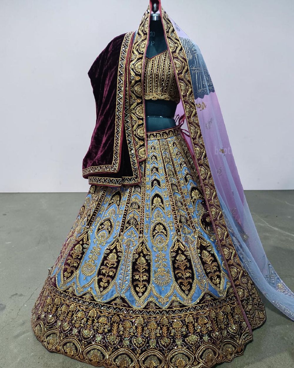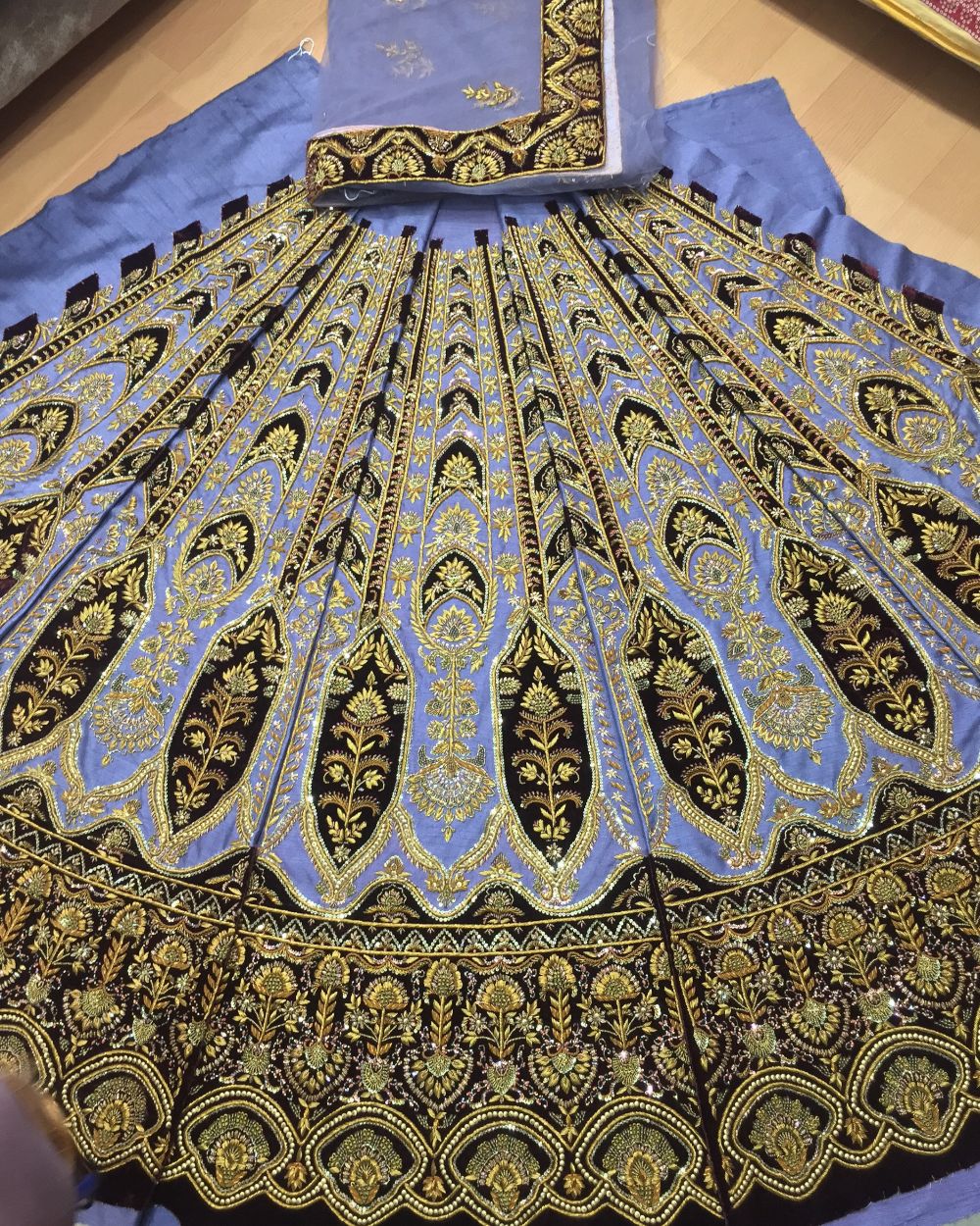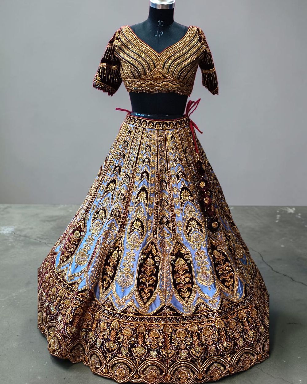 - Product Description – Featuring a magnificent in Raw silk and Tissue silk base, an ideal and aesthetically designed for a contemporary Indian bride. This timeless lehenga set has ageless craftsmanship of glass beads and sequins work. It is gracefully accented with kutdana ,Pot, silk thread, and stone detailing, including a georgette handcrafted dupatta to complete the royal bride’s look.