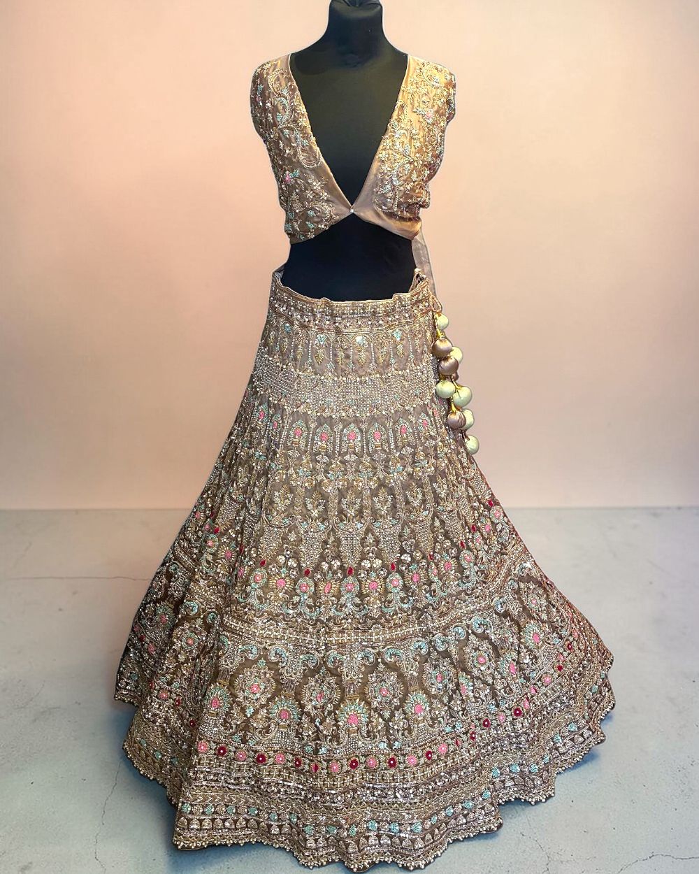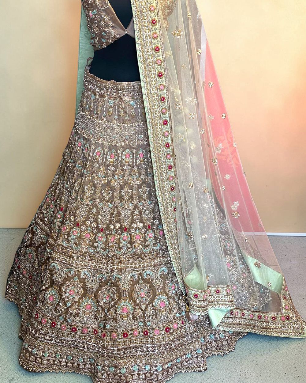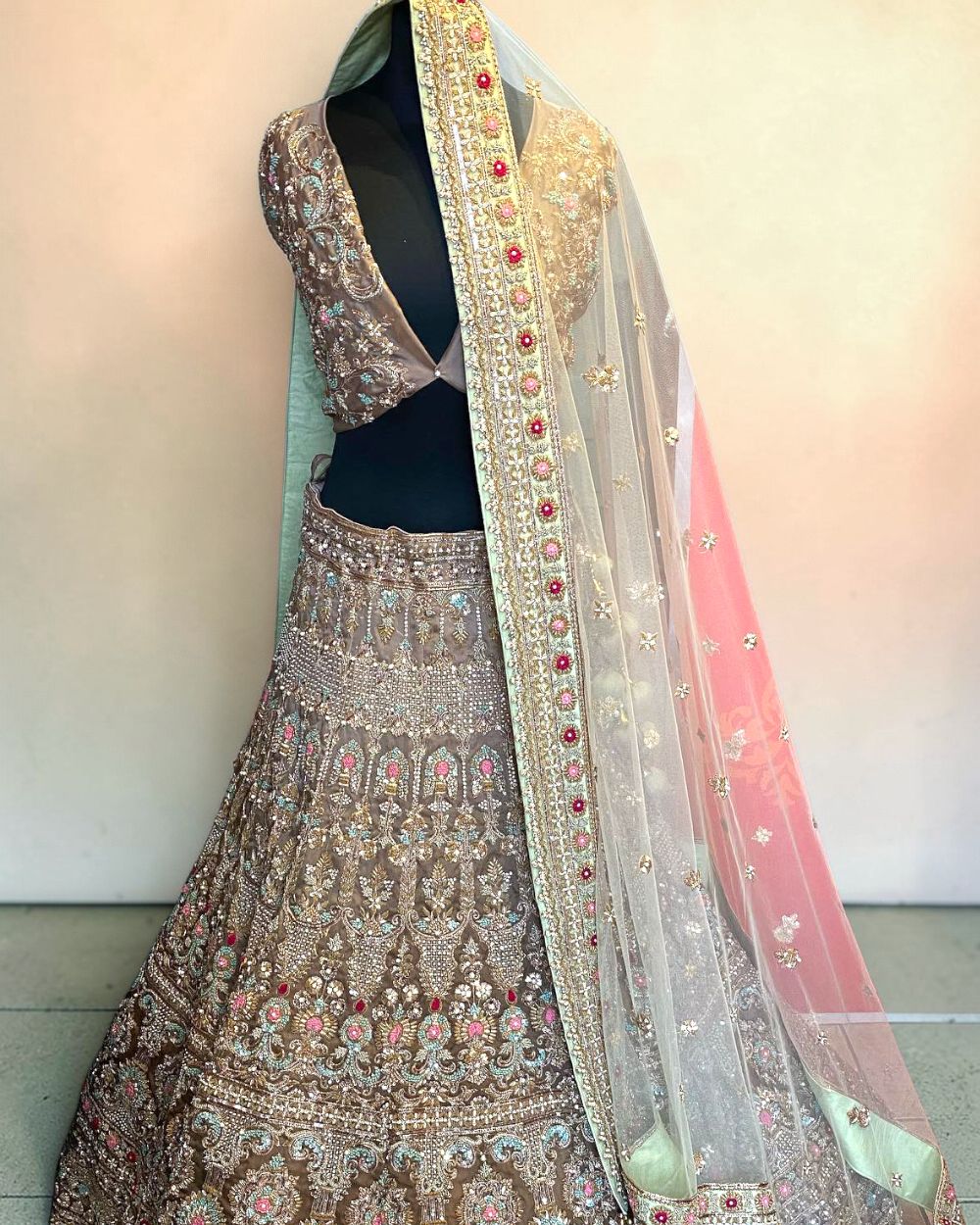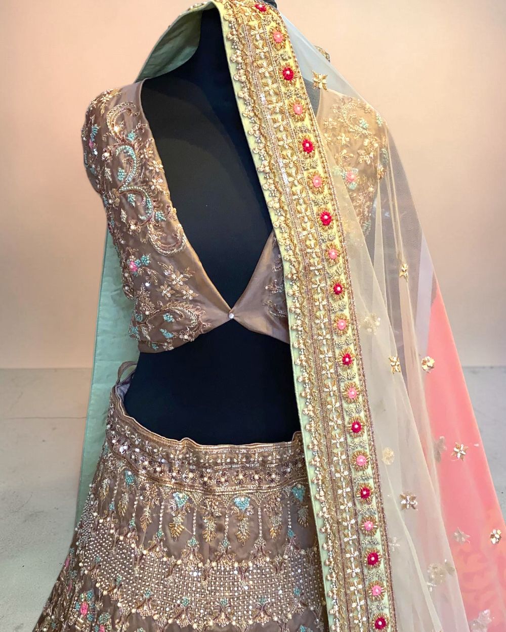 - Product Description – Featuring a magnificent in Raw silk base, an ideal and aesthetically designed for a contemporary Indian bride. This timeless lehenga set has ageless craftsmanship of glass beads and sequins work. It is gracefully accented with kutdana ,Pot, silk thread, and stone detailing, including a georgette handcrafted dupatta to complete the royal bride’s look.