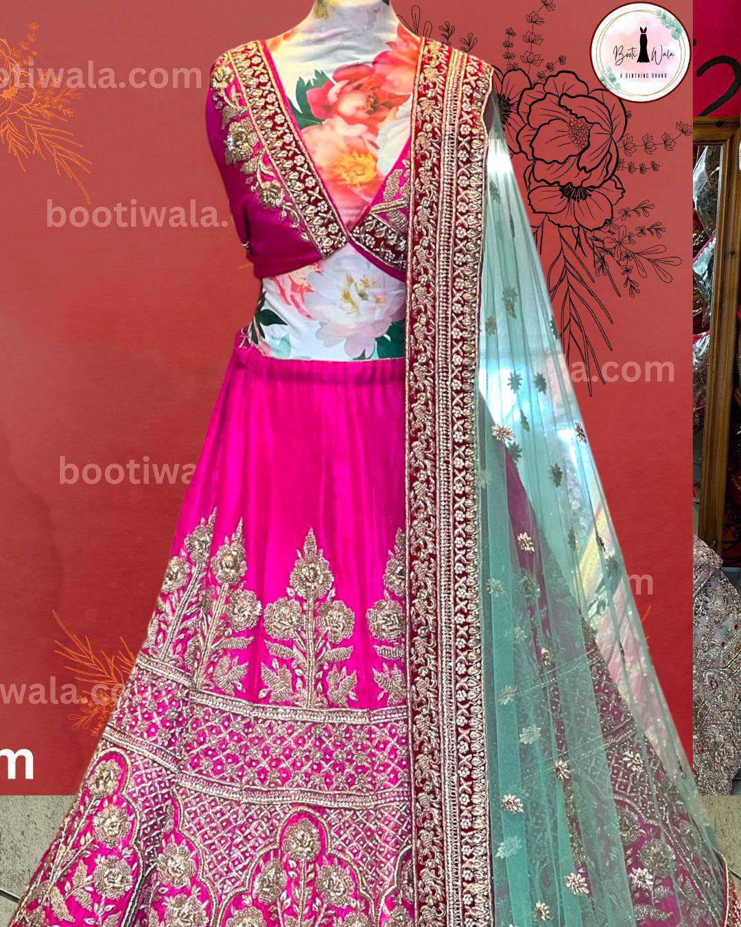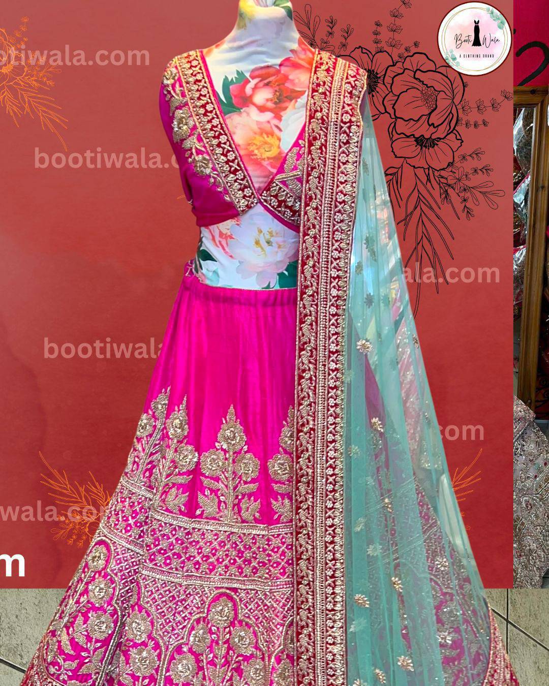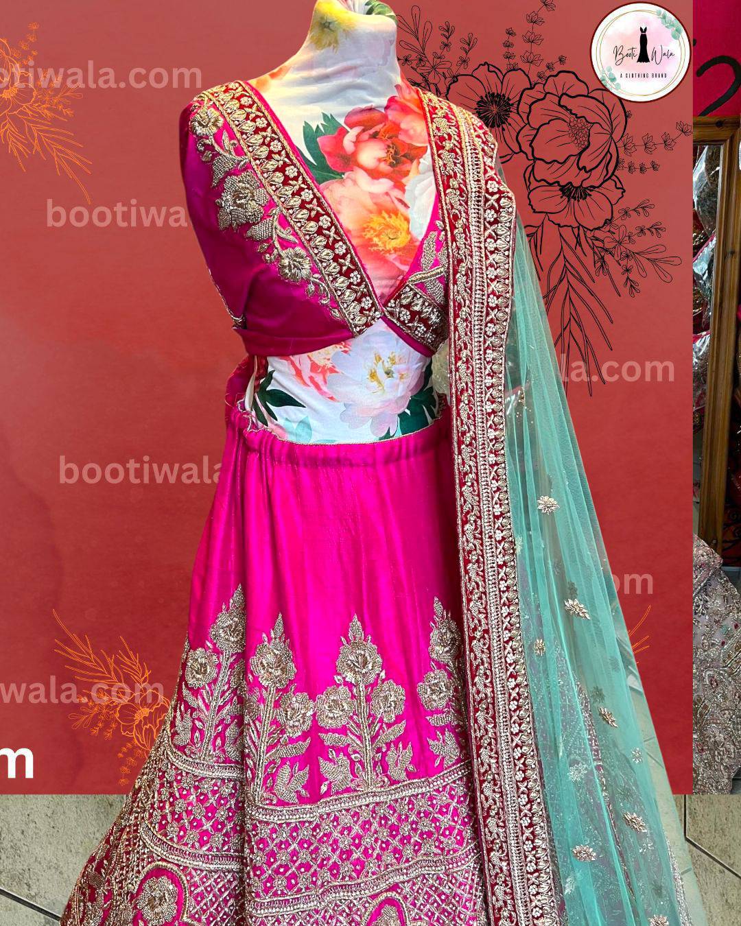 - Product Description – Featuring a magnificent in Velvet base, an ideal and aesthetically designed for a contemporary Indian bride. This timeless lehenga set has ageless craftsmanship of glass beads and sequins work. It is gracefully accented with kutdana ,Pot, silk thread, and stone detailing, including a georgette handcrafted dupatta to complete the royal bride’s look.