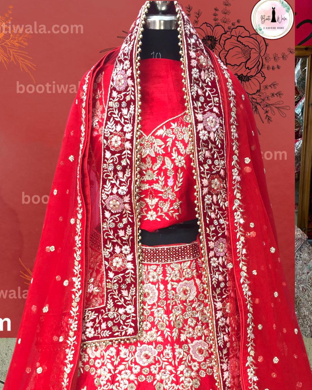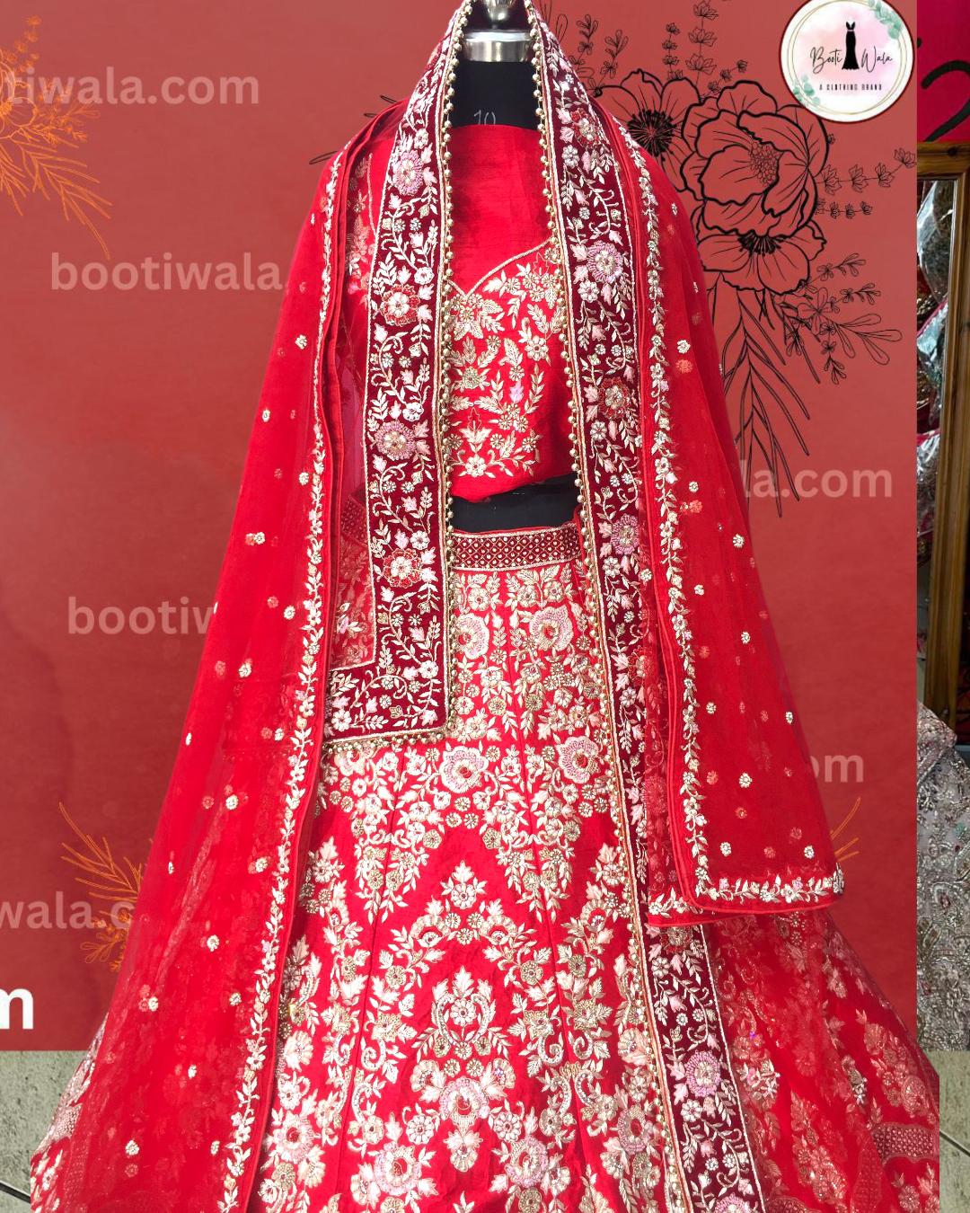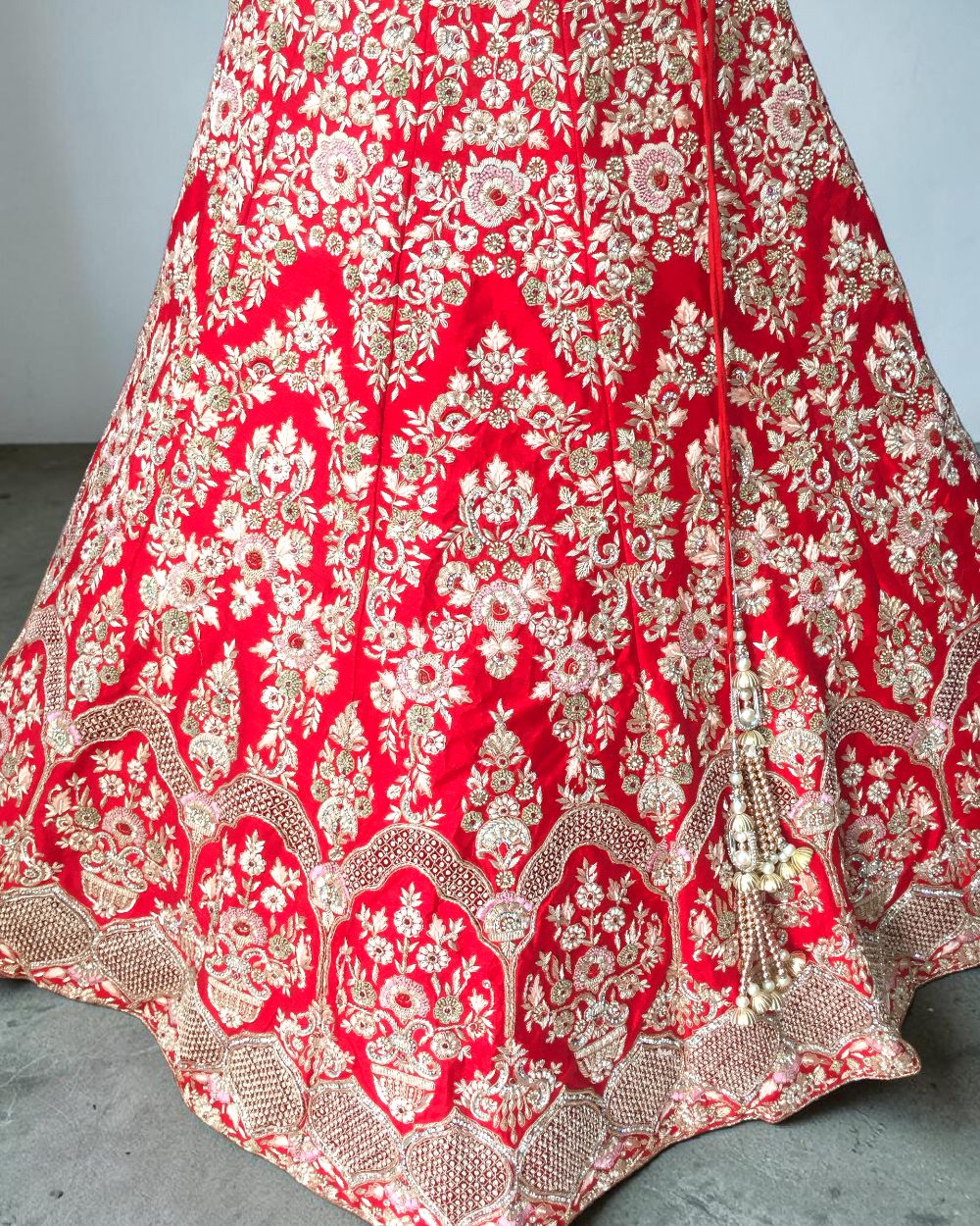 - Product Description – Featuring a magnificent in Raw silk and Organza silk base, an ideal and aesthetically designed for a contemporary Indian bride. This timeless lehenga set has ageless craftsmanship of glass beads and sequins work. It is gracefully accented with kutdana ,Pot, silk thread, and stone detailing, including a georgette handcrafted dupatta to complete the royal bride’s look.