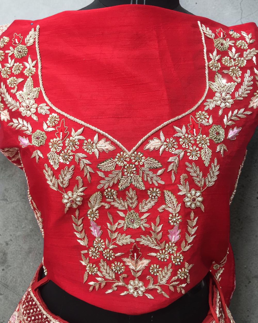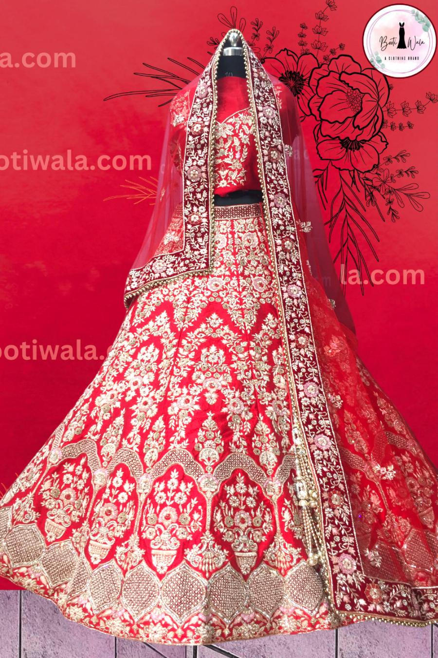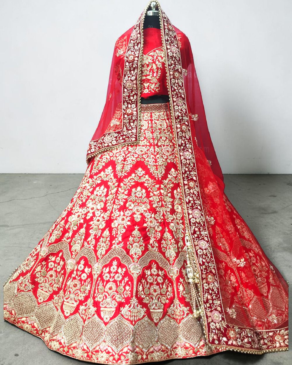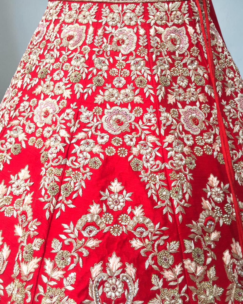 - Product Description – Featuring a magnificent in Raw silk and Organza silk base, an ideal and aesthetically designed for a contemporary Indian bride. This timeless lehenga set has ageless craftsmanship of glass beads and sequins work. It is gracefully accented with kutdana ,Pot, silk thread, and stone detailing, including a georgette handcrafted dupatta to complete the royal bride’s look.