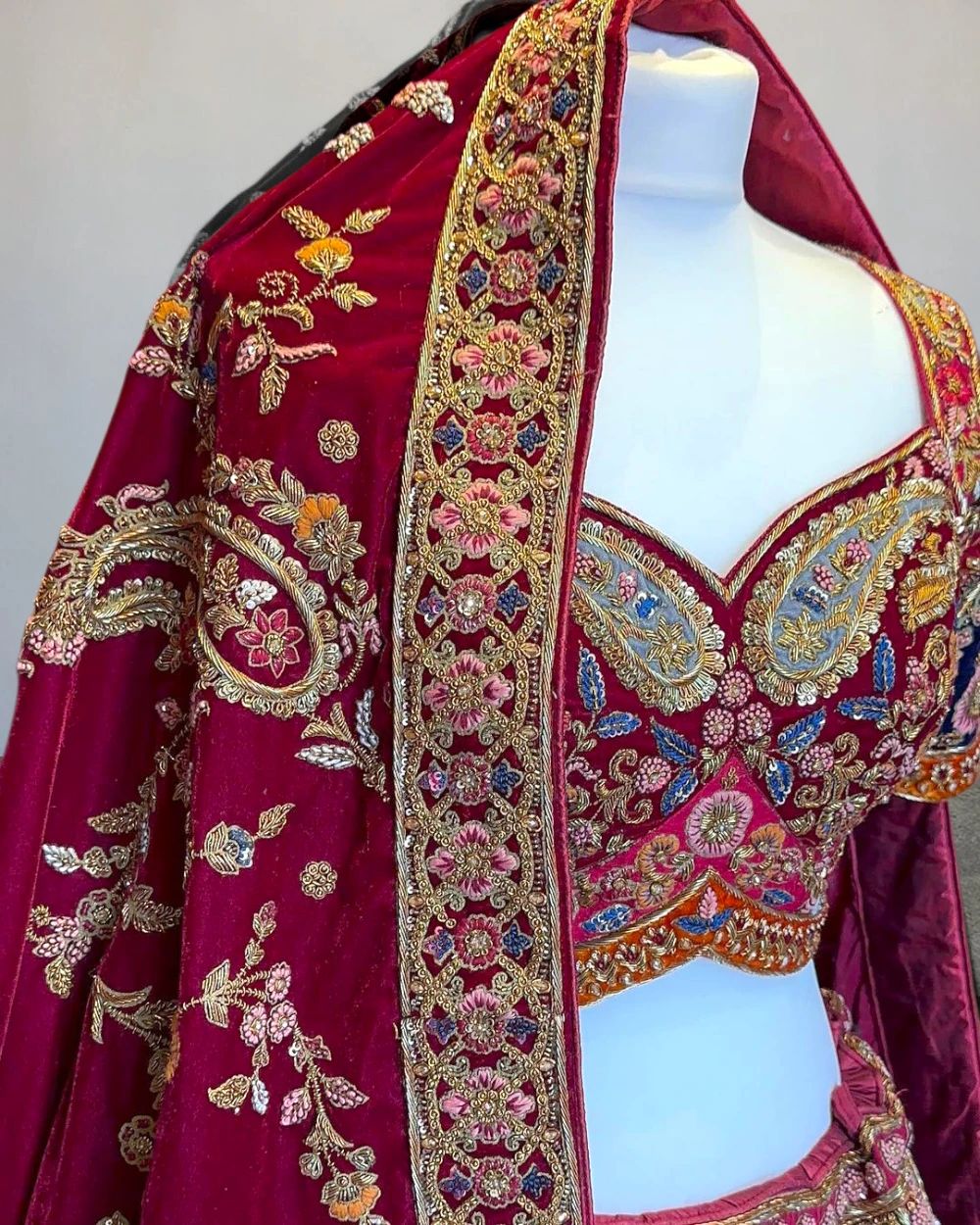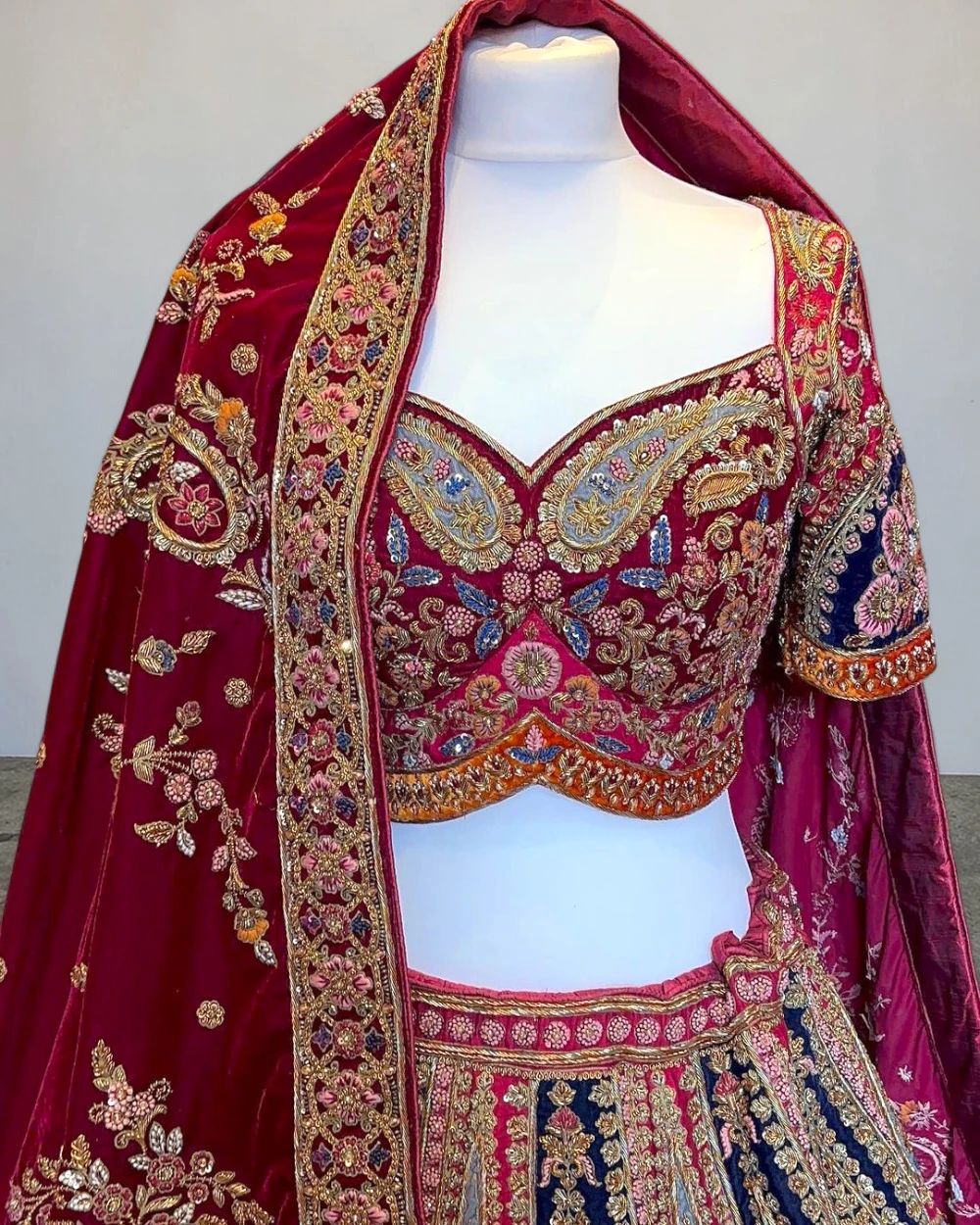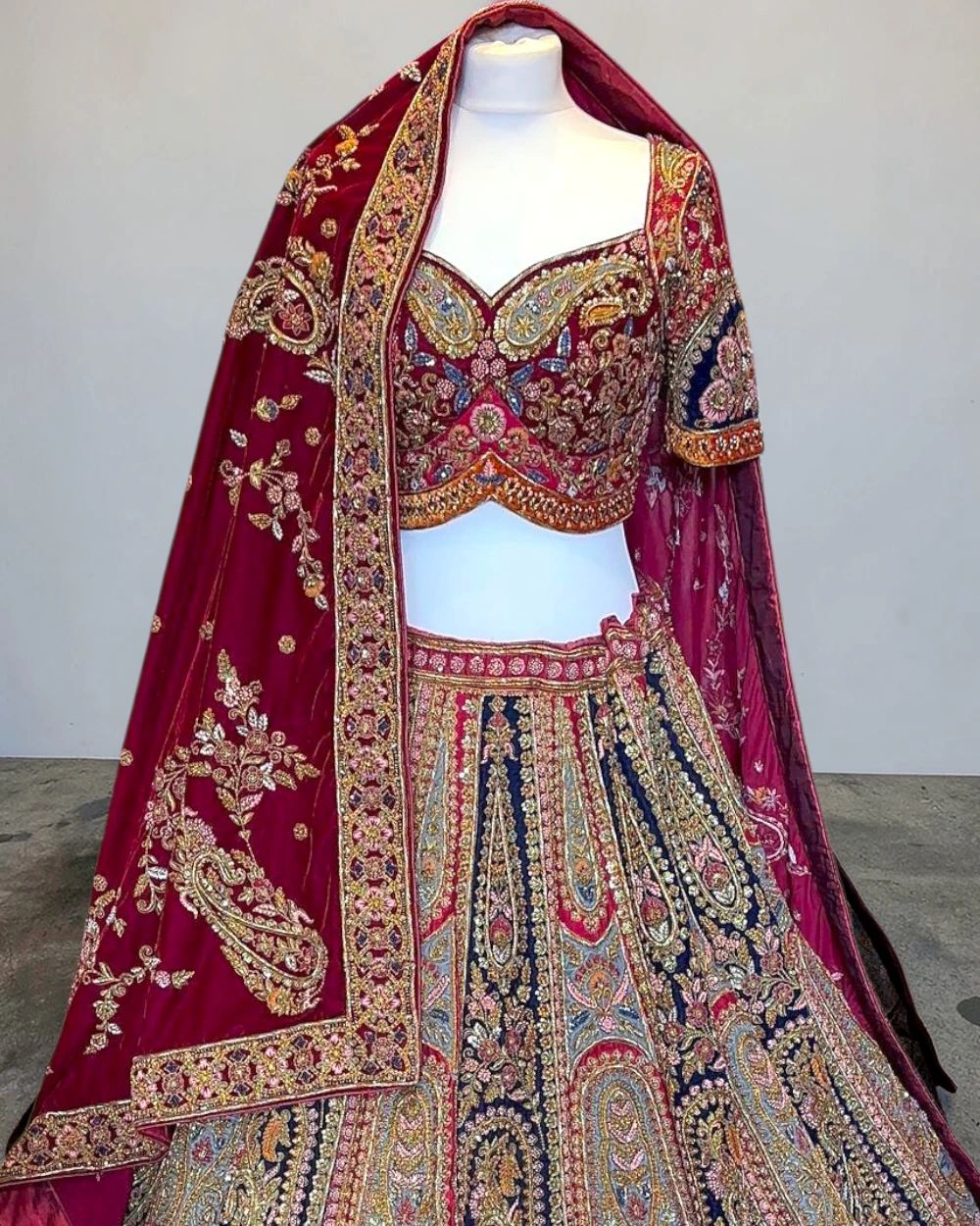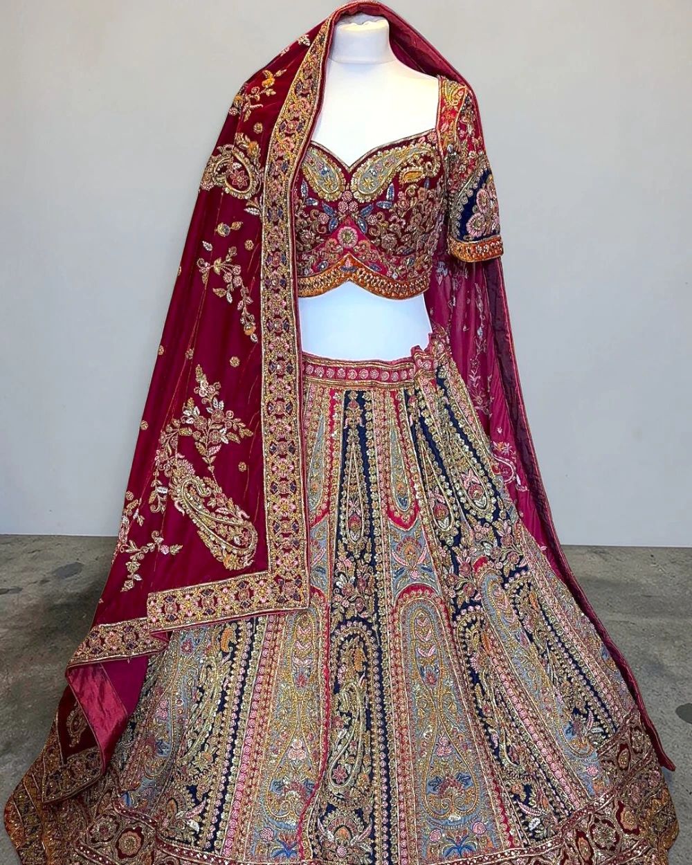- Product Description – Featuring a magnificent in Raw silk fabric base, an ideal and aesthetically designed for a contemporary Indian bride. This timeless lehenga set has ageless craftsmanship of glass beads and sequins work. It is gracefully accented with kutdana ,Pot, silk thread, and stone detailing, including a georgette handcrafted dupatta to complete the royal bride’s look.