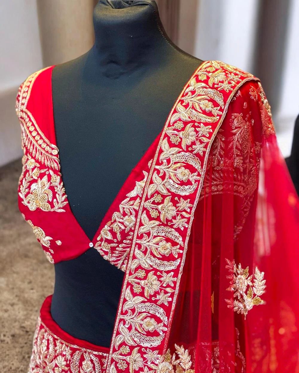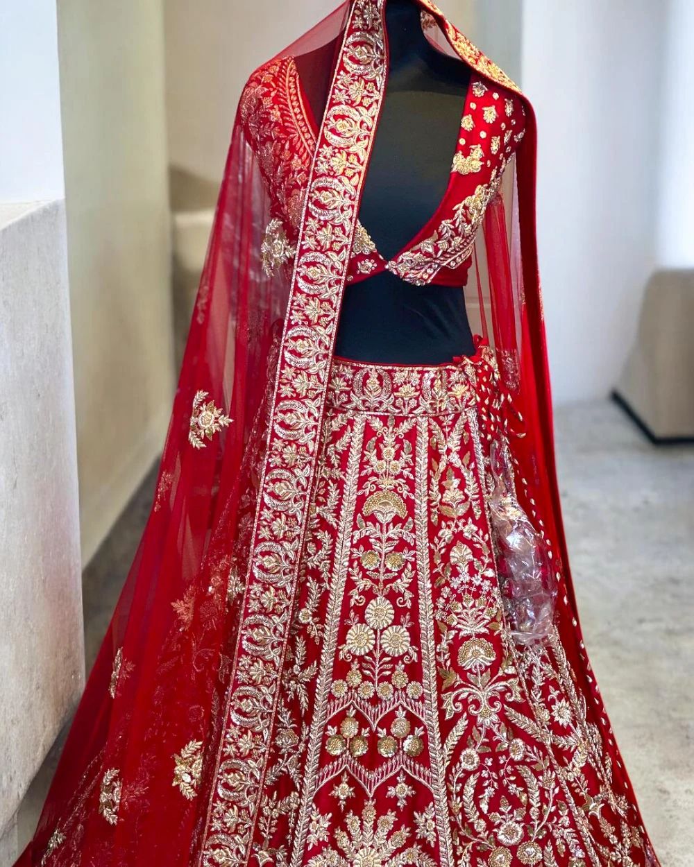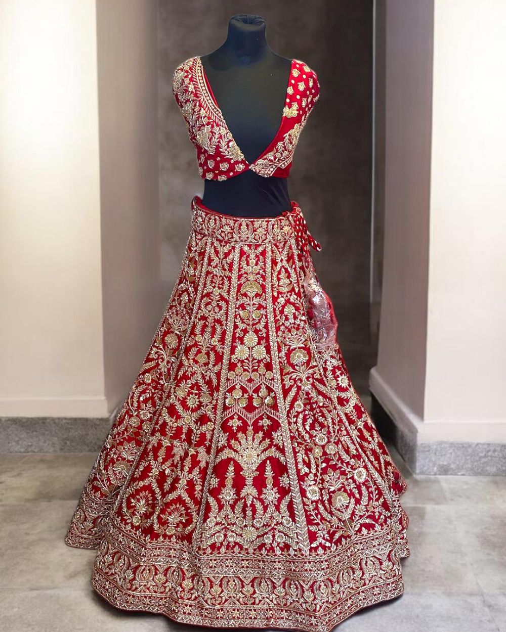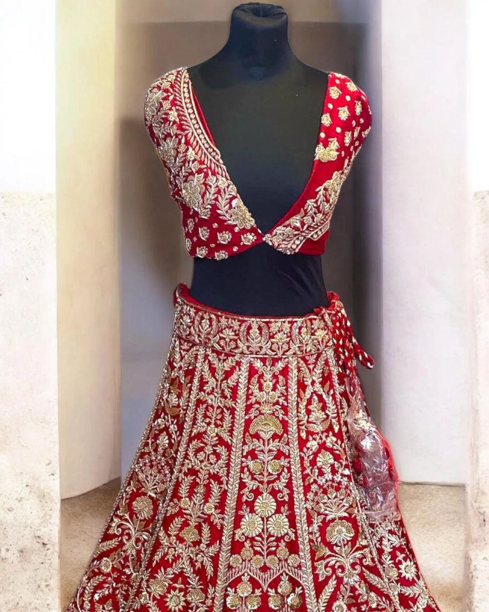 - Product Description – Featuring a magnificent in Velvet fabric base, an ideal and aesthetically designed for a contemporary Indian bride. This timeless lehenga set has ageless craftsmanship of glass beads and sequins work. It is gracefully accented with kutdana ,Pot, silk thread, and stone detailing, including a georgette handcrafted dupatta to complete the royal bride’s look.