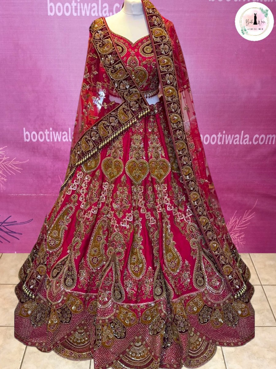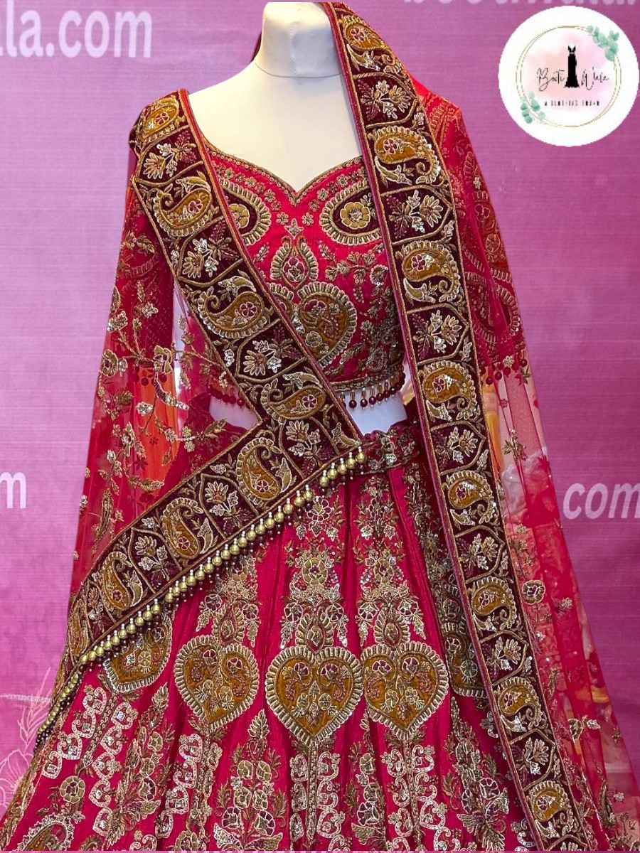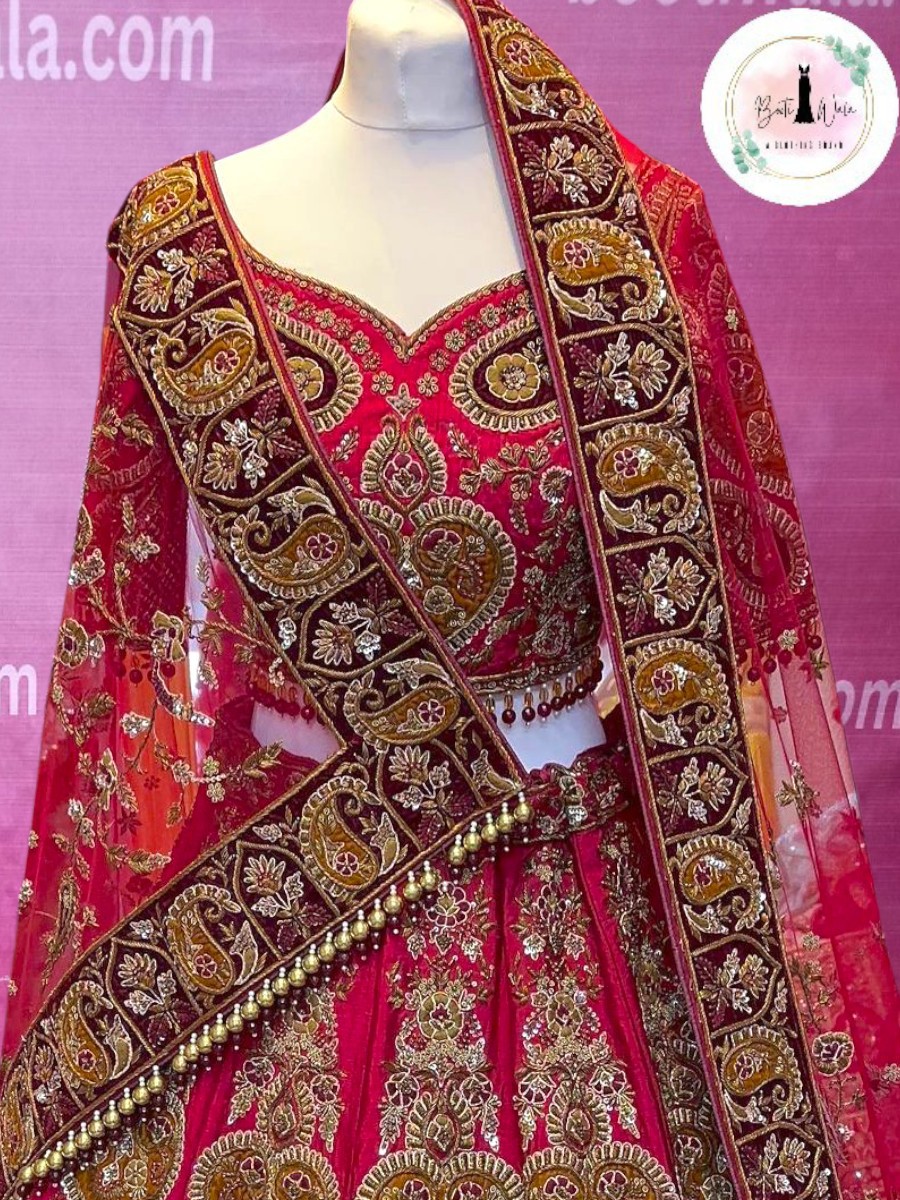 - Product Description – Featuring a magnificent in Raw silk and Organza silk base, an ideal and aesthetically designed for a contemporary Indian bride. This timeless lehenga set has ageless craftsmanship of glass beads and sequins work. It is gracefully accented with kutdana ,Pot, silk thread, and stone detailing, including a georgette handcrafted dupatta to complete the royal bride’s look.